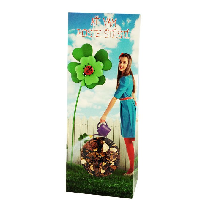 Dárková krabička Ať Vám roste štěstí s dekorací čtyřlístku s beruškou.