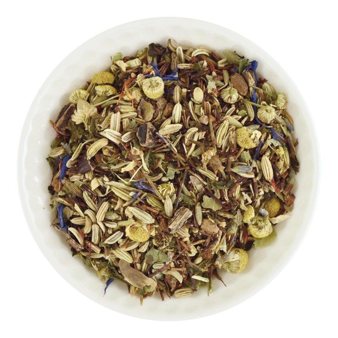 Složení: fenykl, rooibos, zelený rooibos, květy heřmánku, kousky rohovníka, meduňka, skořice, květy lípy a levandule, kořen kozlíka, extrakt z ashwagandhy, mučenka, přírodní aroma, lupínky světlice a chrpy