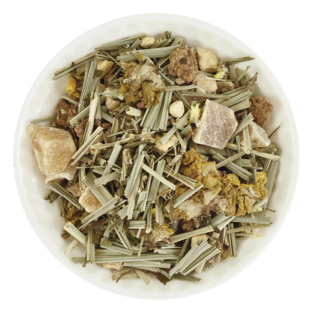 Složení: papája (papája, cukr, regulátor kyselosti: kyselina citronová), kousky zázvoru (zázvor, cukr), citronová tráva, list ostružiny, sušená dužina pomerančové šťávy, kociánek dvoudomý, květy divizny