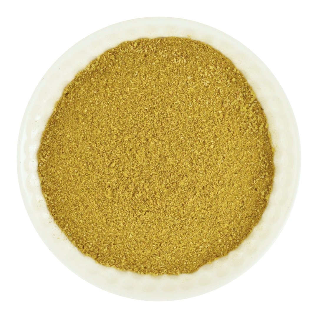 Složení: kari (koriandr, kurkuma, pískavice řecká, římský kmín, zázvor, hřebíček, fenykl, bobkový list, česnek, skořice, sůl, černý pepř, sušené mango, kukuřice, přírodní barvivo: kurkumový oleoresin), sůl, mletý koriandr, mletá pálivá paprika, cukr, sladká paprika, kukuřičná mouka, přírodní barvivo: extrakt z papriky E160c