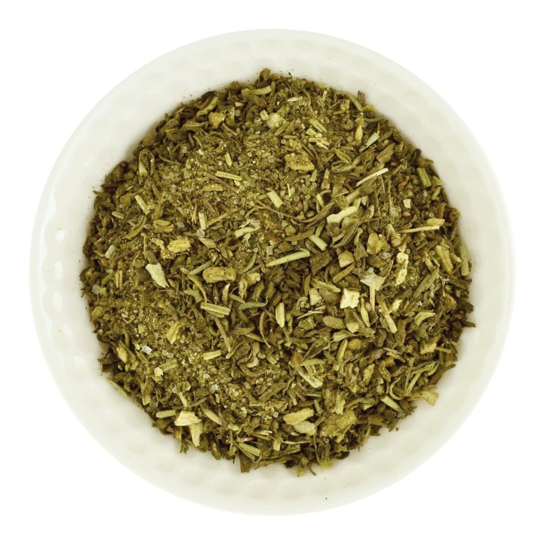 Složení: sůl, směs sušených mletých koření a bylinek v různých poměrech 23,5 % (saturejka, pažitka, tymián, mletý černý pepř, rozmarýn, kurkuma), jemná kukuřičná mouka, cukr, sušený granulovaný česnek, sušená cibulová krupice, sušená krupice z kořene pastináku