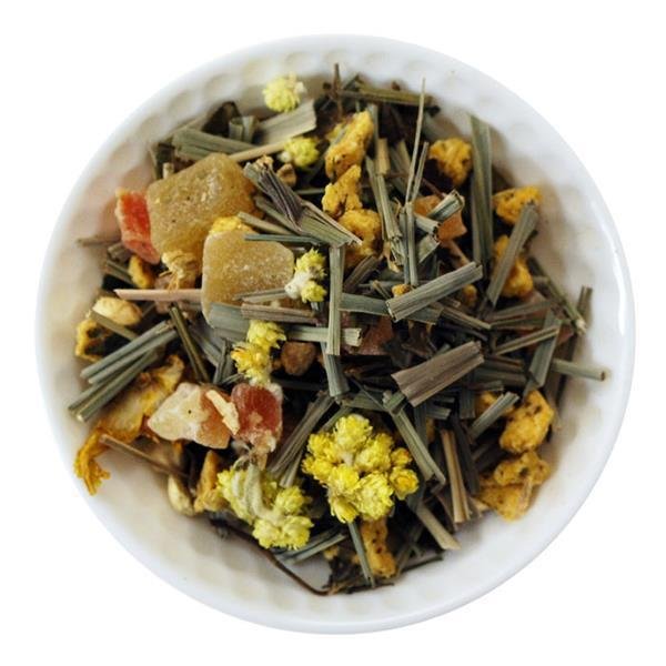 Složení: papája (papája, cukr, regulátor kyselosti: kyselina citronová), kousky zázvoru (zázvor, cukr), citronová tráva, list ostružiny, sušená dužnina pomerančové šťávy, kociánek dvoudomý, květy divizny