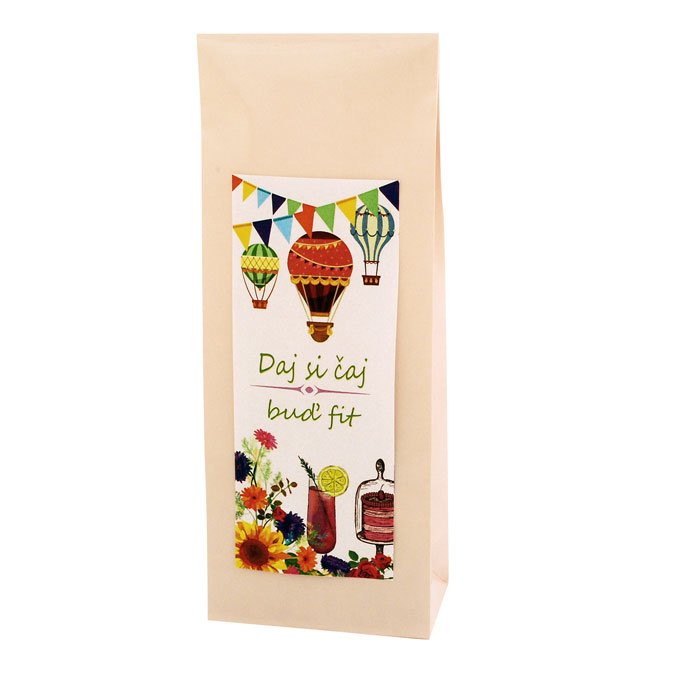 Dárkový čaj balený v růžovem sáčku. Text: Dej si čaj a buď fit. Složen… Více