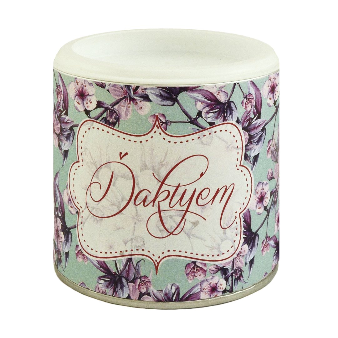 Elegantní dárková dóza s jemným motivem třešňových květů na pastelově modrém pozadí je krásným způsobem poděkování.