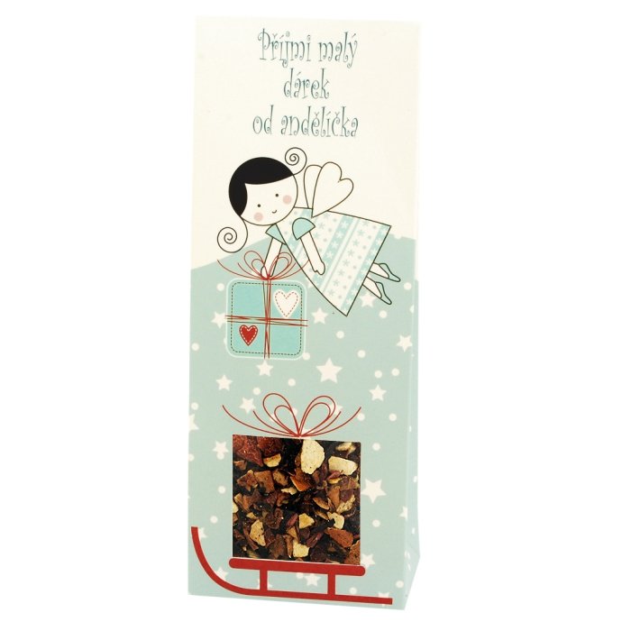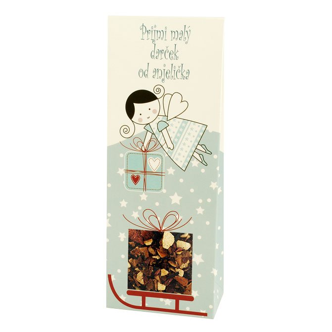 Dárková krabička Dobrý Anděl s motivem rozkošného andílka s dárkem na sáňkách.