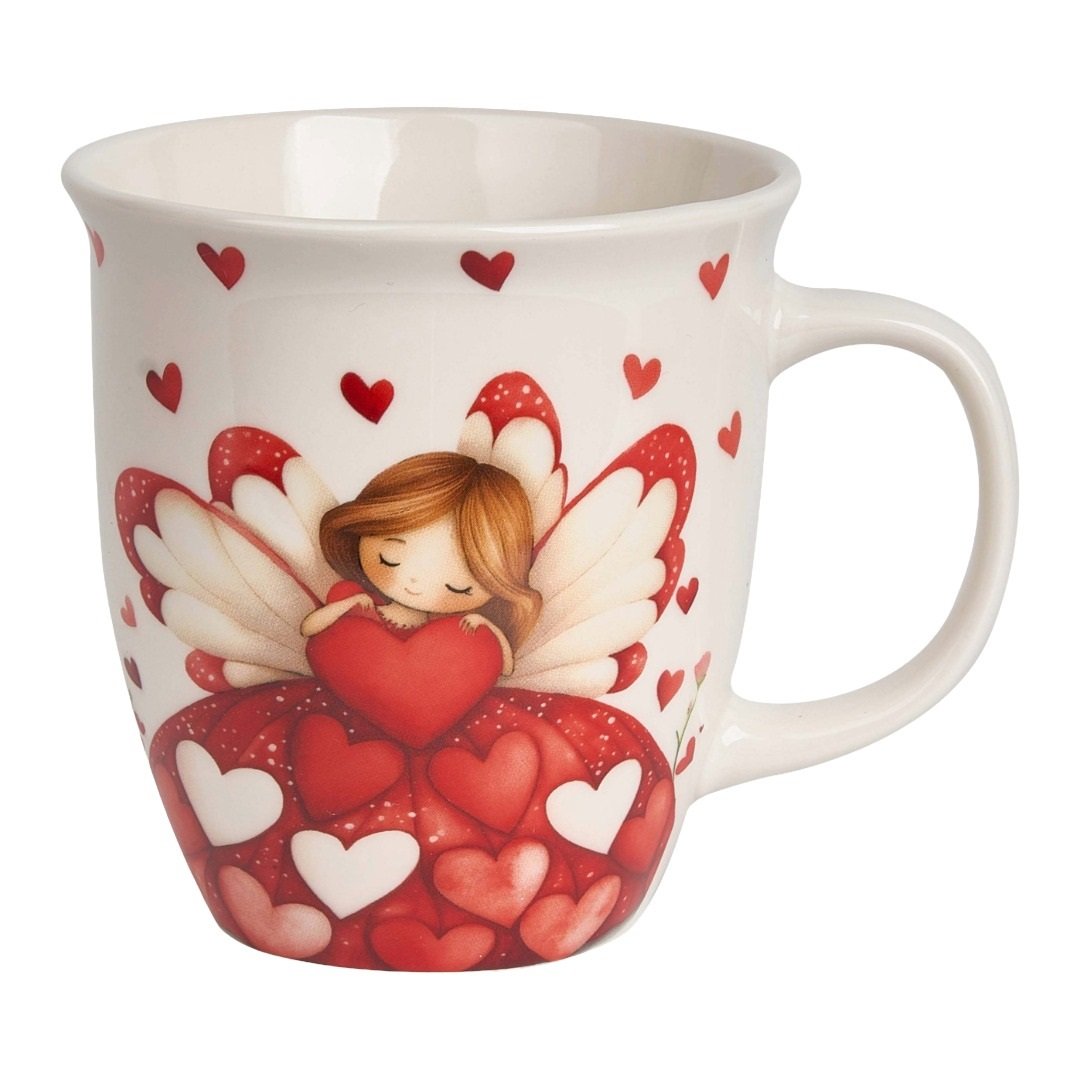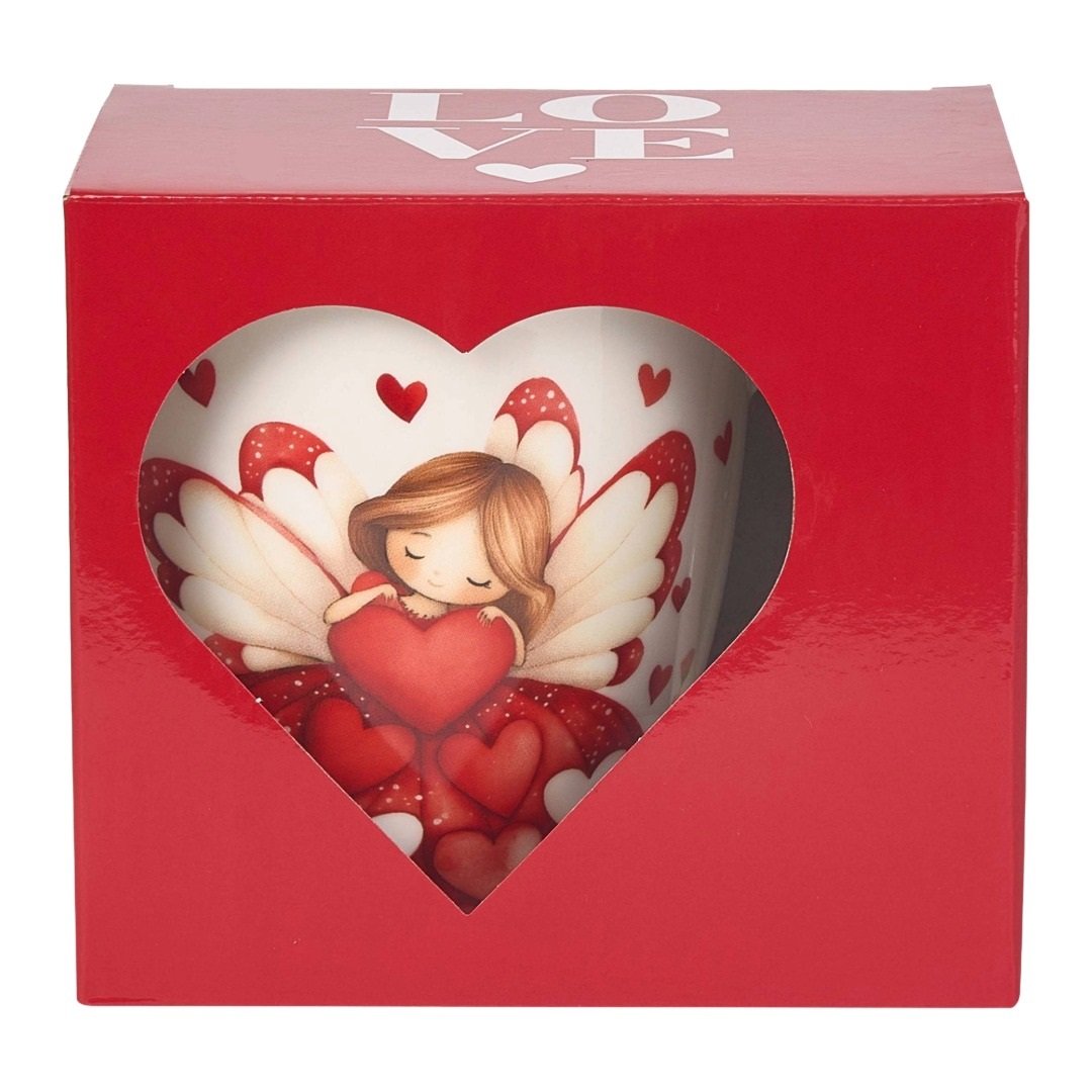 Klasický hrnek s motivem rozkošné holčičky s andělskými křídly obklopené růžovými a červenými srdíčky. Hrnek je zabalen v červené dárkové krabičce se srdíčkem.