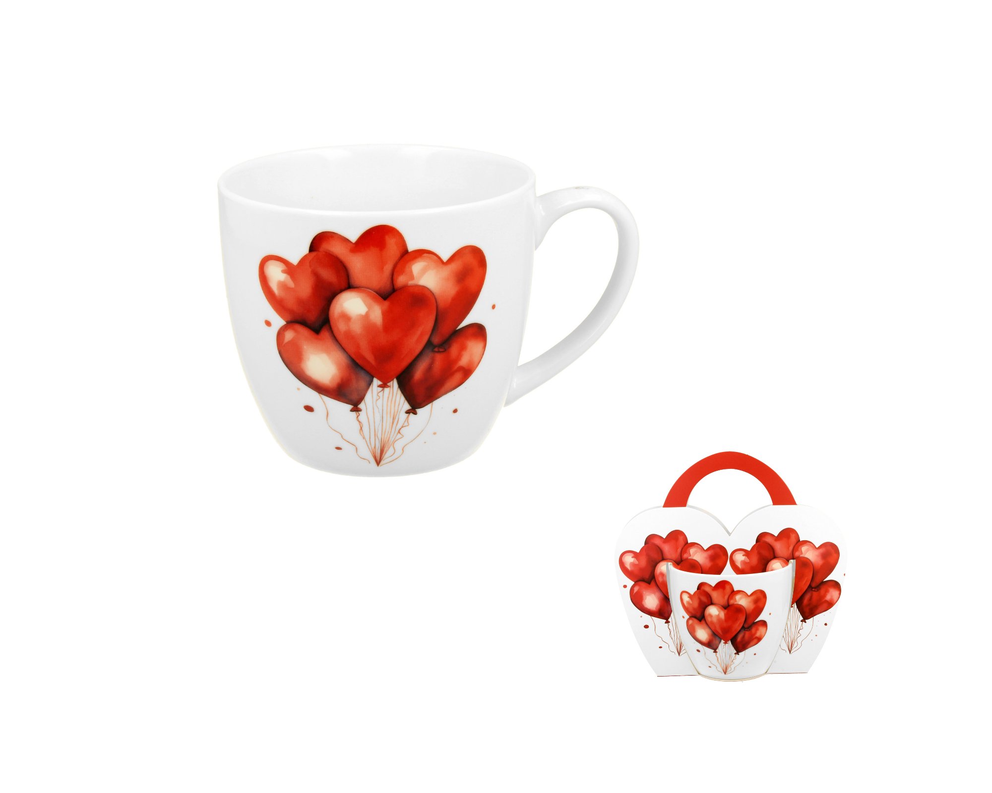 Klasický hrnek s výrazným motivem červených balonů ve tvaru srdce zabalený v originálním papírovém obalu s uchem se stejným motivem. S tímto hrníčkem dostanou rána u kávy nebo večery s čajem nový, romantický rozměr.