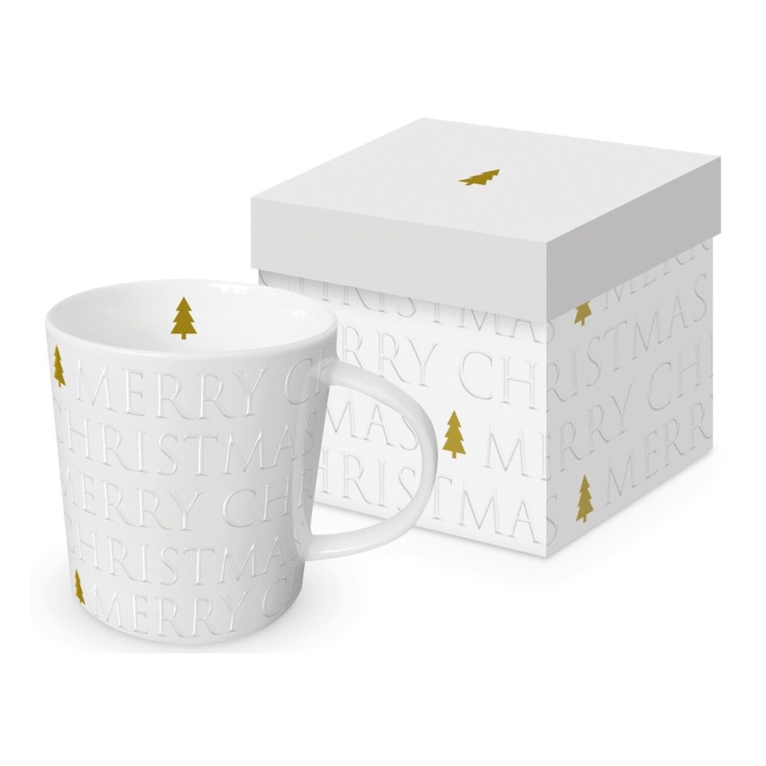 Prudce elegantní bílý hrnek s jemným motivem zlatého stromku a reliéfním nápisem MERRY CHRISTMAS.