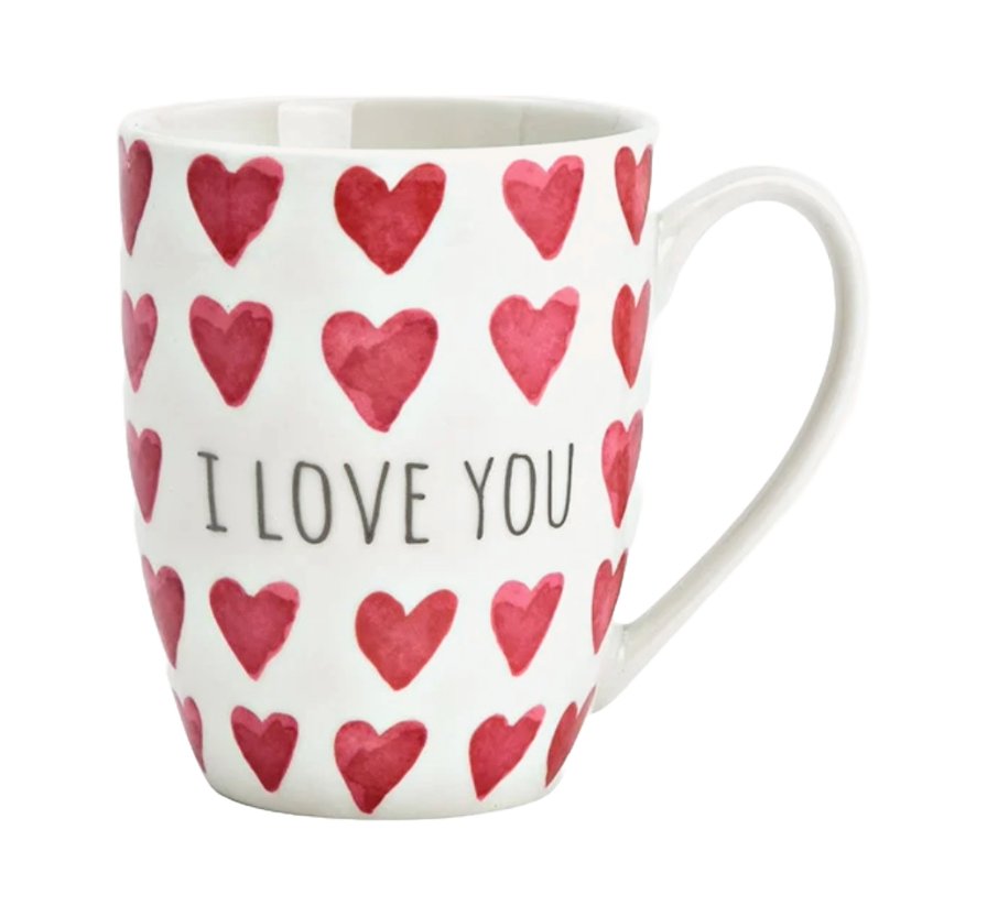 Porcelánový hrníček s motivem srdíček a nápisem I Love You.