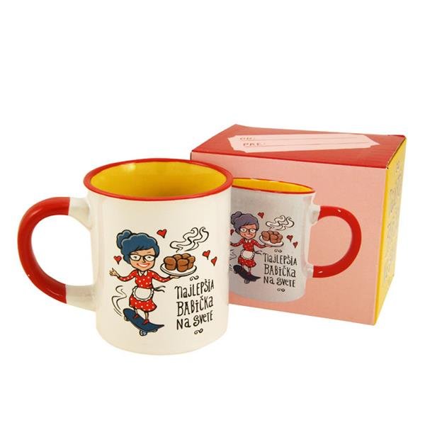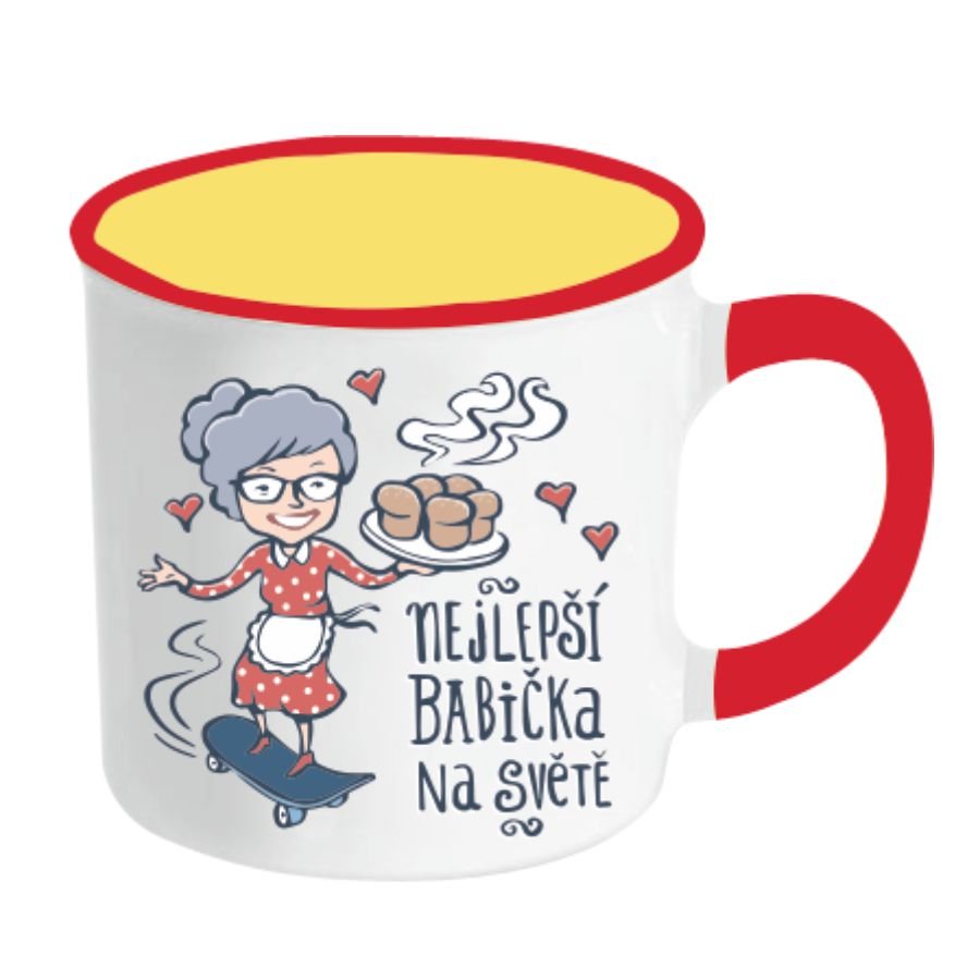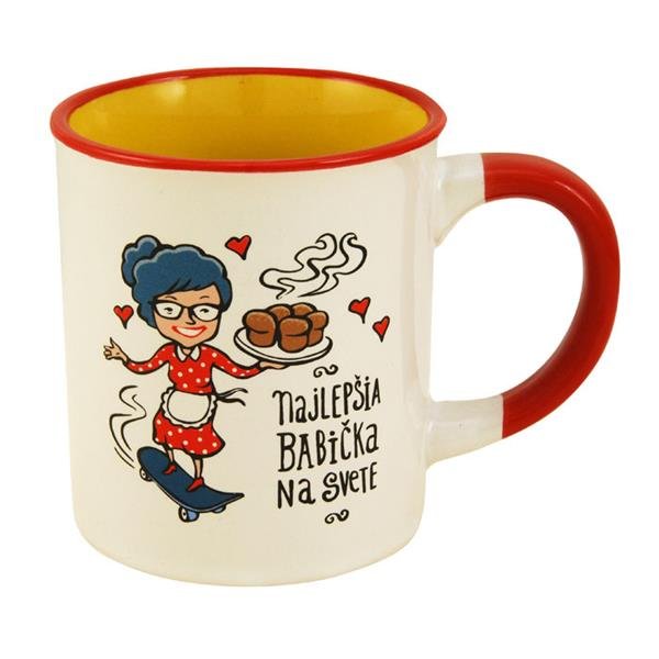 Rádi byste ukázali své babičce, že ji máte rádi? Hrnek "Nejlepší babička na světe" je pro ni jako stvořený! Odteď si může vychutnávat svůj oblíbený čaj či kávu a při tom myslet na Vás. Jedinečný hrnek bílé barvy s obrázkem babičky v zástěře s čerstvě napečenými koláčky, která se veze na skateboardu, je dokonalým zobrazením toho, jaké jsou naše babičky všestranné a pečlivé. Hrnek má červené ouško a žlutý vnitřek.