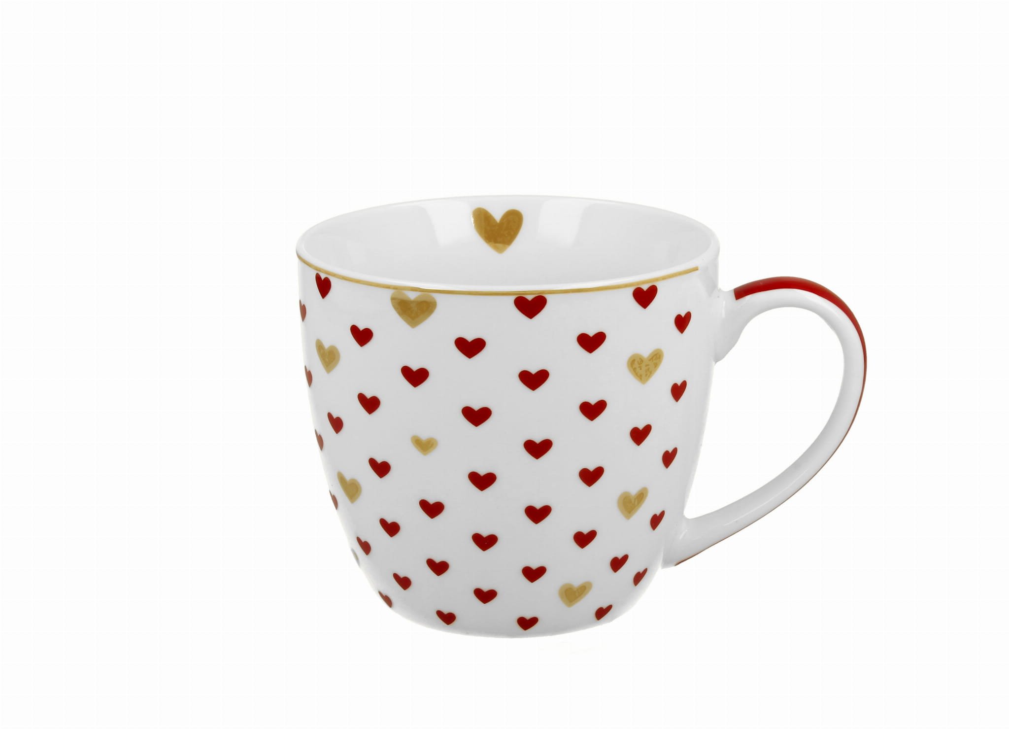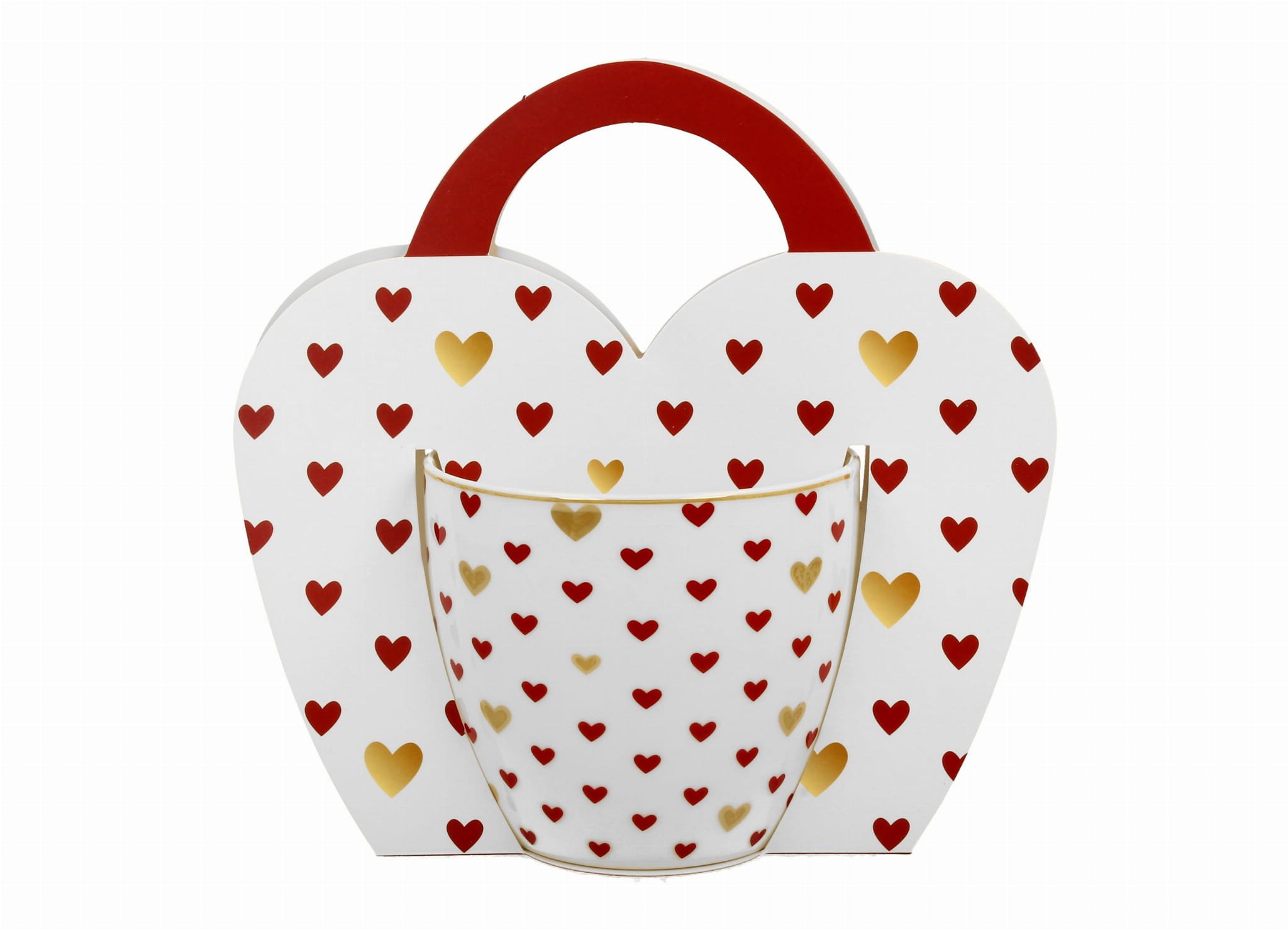 Hrnek zdobený zlatými a červenými srdíčky na bílém podkladu.