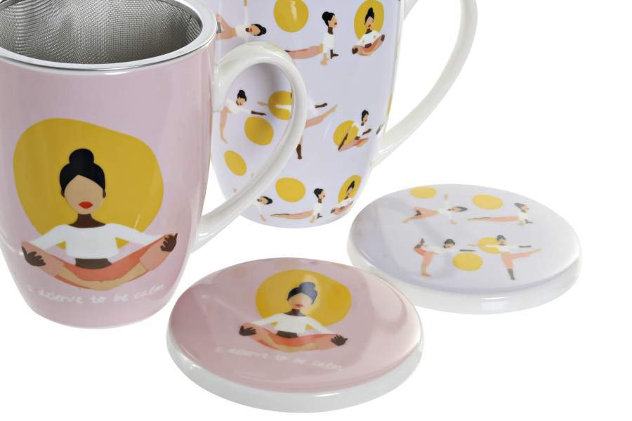 Porcelánový čajový set se sitkem pro všechny milovníky tohoto lahodného nápoje se stylovým motivem cvičenek jógy. Hrneček můžete zakoupit ve dvou variantách. Hrneček může jít do mikrovlnné trouby (bez sítka) a taky do myčky nádobí.