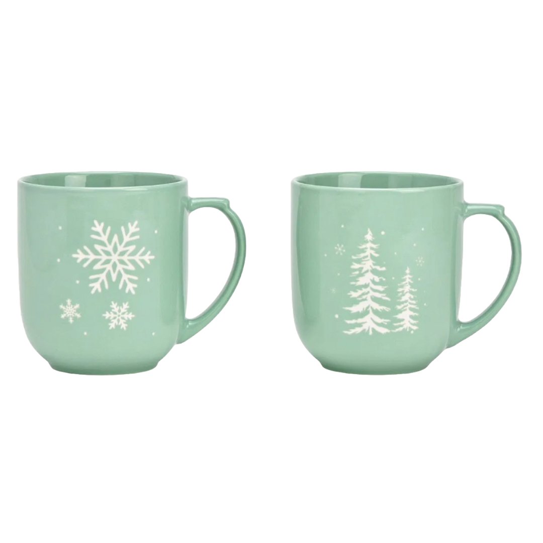 Velký hrnek v krásné mátové barvě se zimním motivem. Dostupný ve dvou provedeních - se sněhovými vločkami a zasněženými stromy.