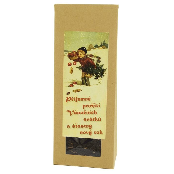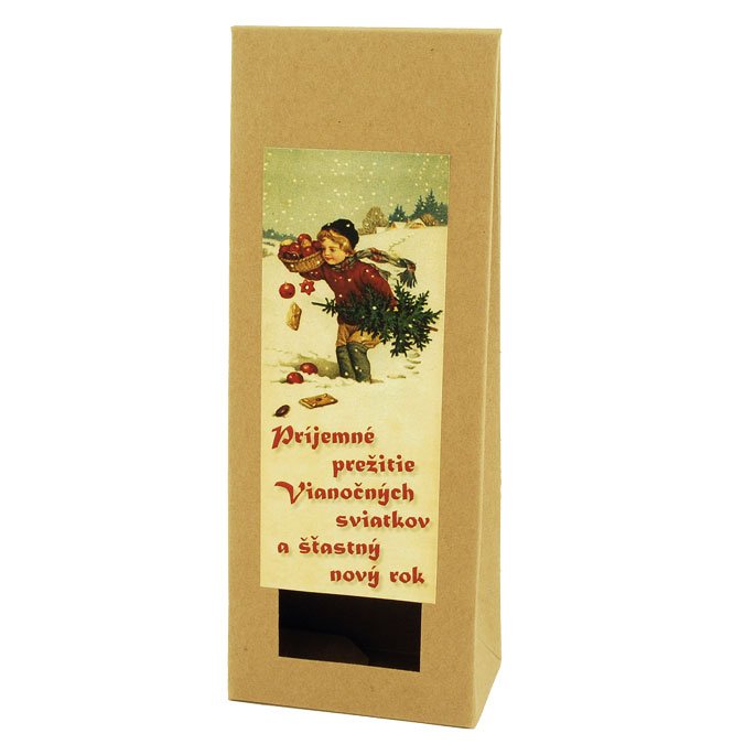 Přírodní dárková krabička Kouzelná chvíle s milým retro motivem chlapečka s vánočním stromečkem.