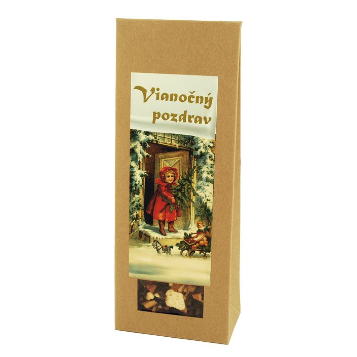 Přírodní dárková krabička Vánoční pozdrav s milým retro motivem holčičky v červeném kabátku se stromečkem.