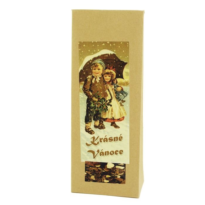 Přírodní dárková krabička Krásné Vánoce s milým retro motivem dětí s cesmínou pod zasněženým deštníkem.