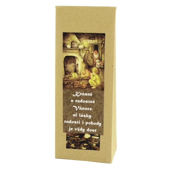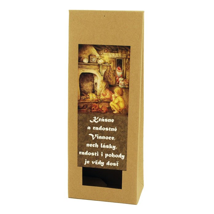 Přírodní dárková krabička Kouzelná chvíle s milým retro motivem chlapečka čekajícího u krbu na Santa Clause.