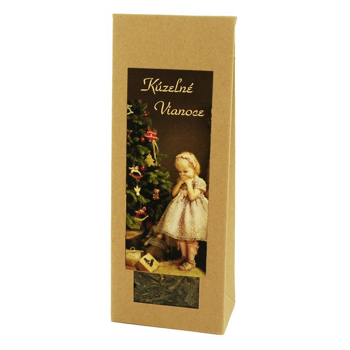 Přírodní dárková krabička Kouzelné Vánoce s milým retro motivem překvapené holčičky u vánočního stromku.