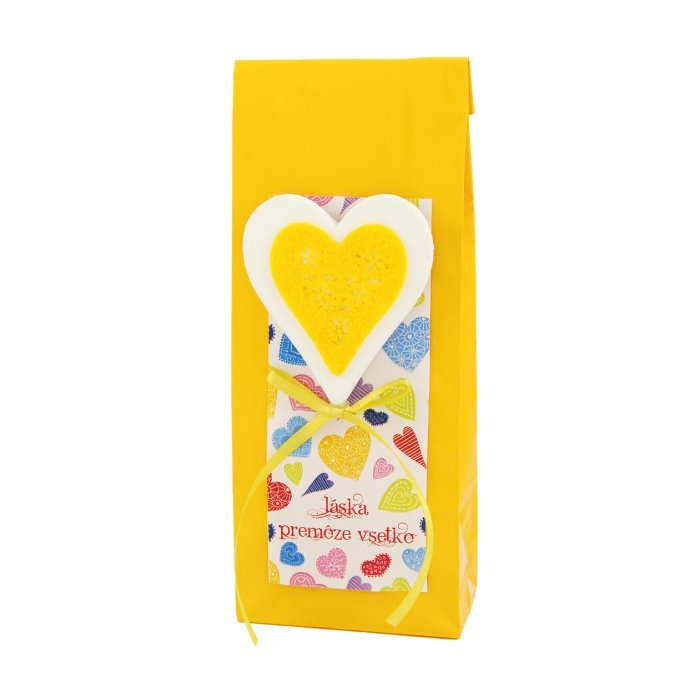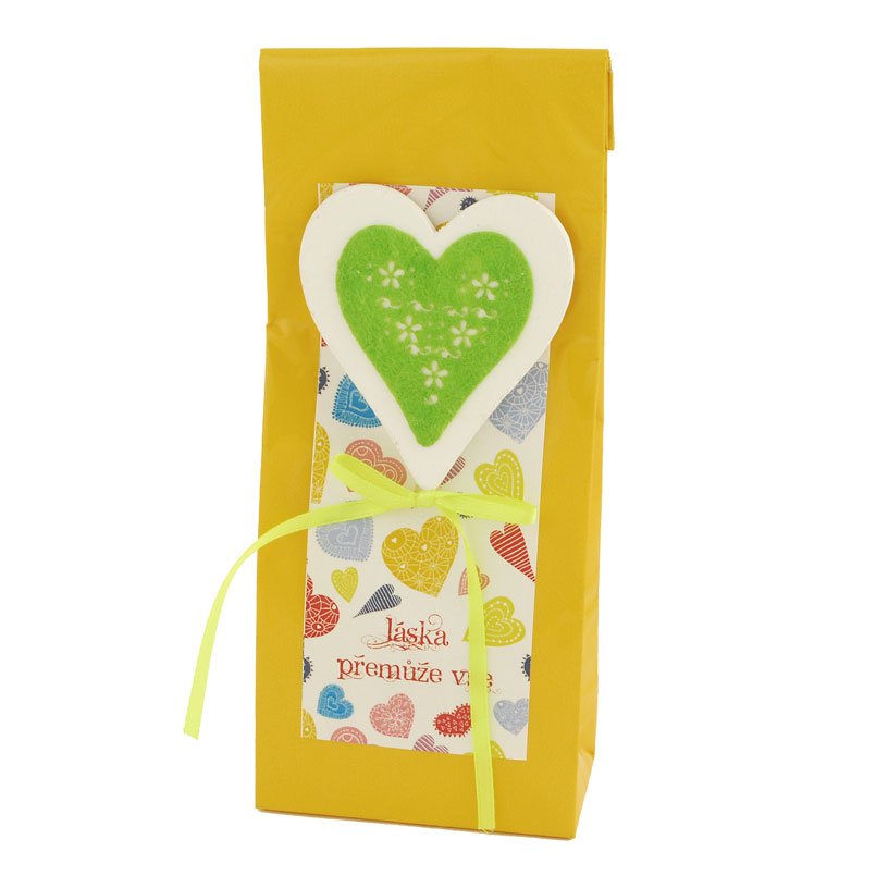 Dárkový čaj s dekorací srdíčka.