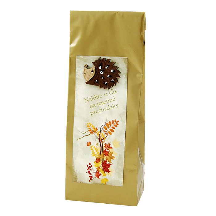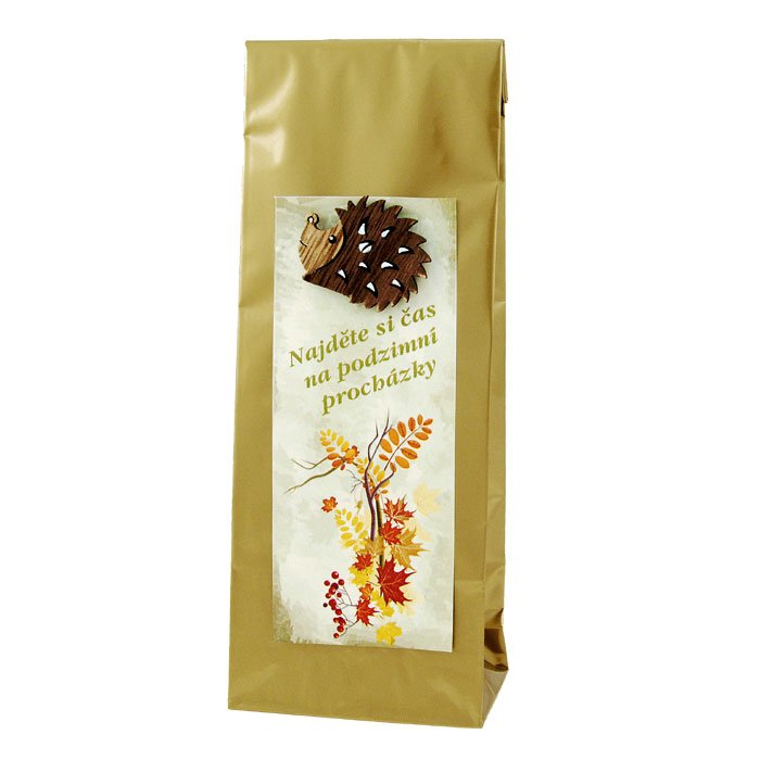 Dárkový čaj s dřevěnou dekorací s podzimním motivem.