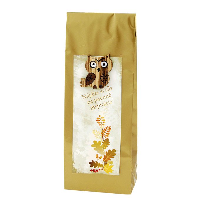 Dárkový čaj s dřevěnou dekorací s podzimním motivem.