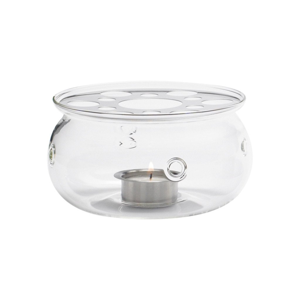 Skleněný ohřívač čaje z varného skla s nerezovým odnímatelným vrchem a držákem svíčky. Čajová svíčka v něm umocňuje příjemnou atmosféru posezení u čaje.