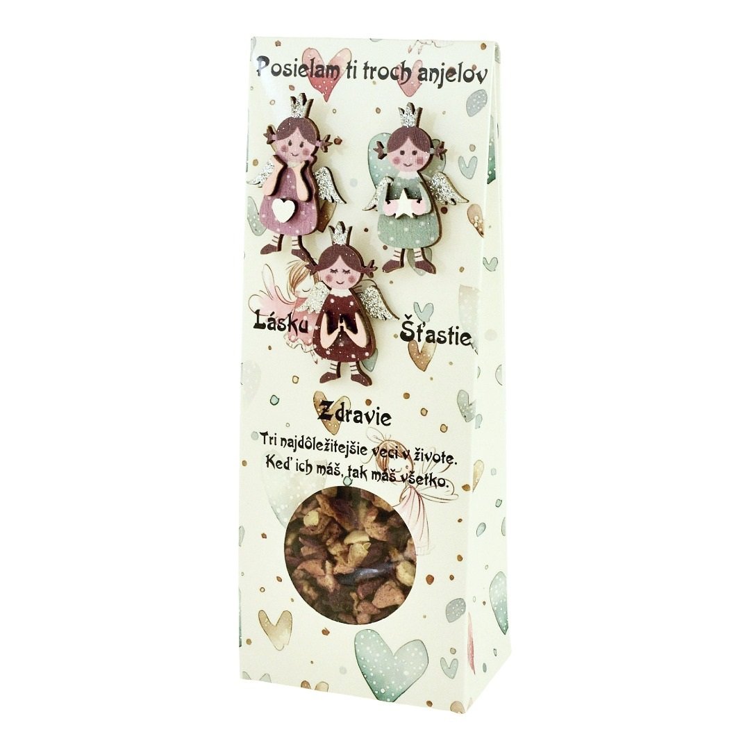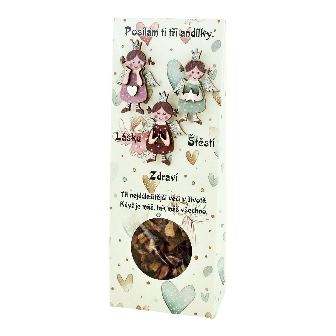 Rozkošná dárková krabička se srdíčkovým motivem a třemi milými figurkami andílků - Lásky, Štěstí a Zdraví.