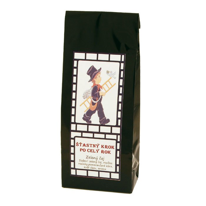 Dárkový čaj s novoročním motivem v černém sáčku.