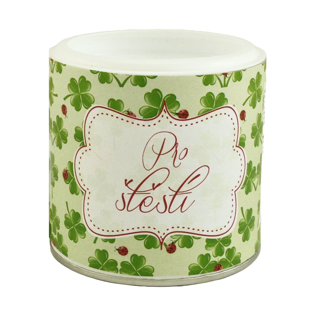 Hravá dárková dóza s motivem čtyřlístku s beruškou, tradičního symbolu štěstí a radosti.