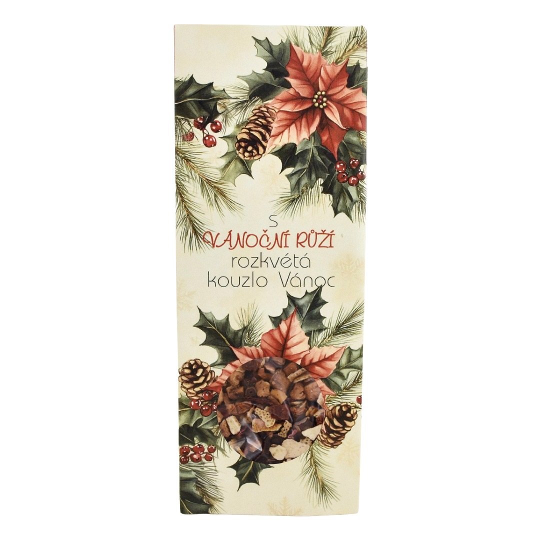 Elegantní dárková krabička s motivem krásného vánočního aranžmá z vánoční růže, cesmíny a větviček se šiškami.