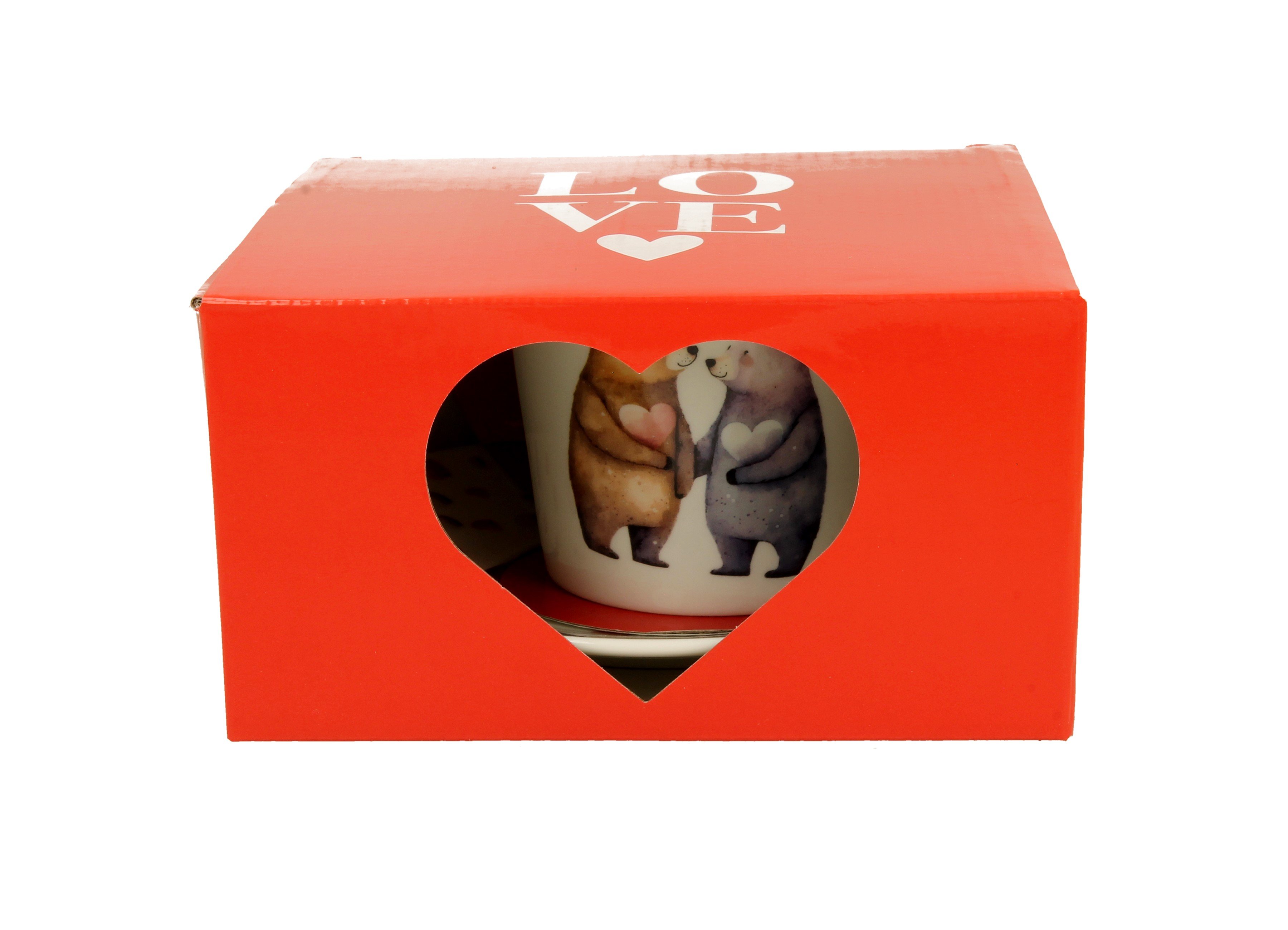Elegantní porcelánový šálek s talířkem s motivem rozkošných zamilovaných medvídků zabalený v červené dárkové krabičce se srdíčkem. S tímto šálkem dostanou rána u kávy nebo večery s čajem nový, romantický rozměr.