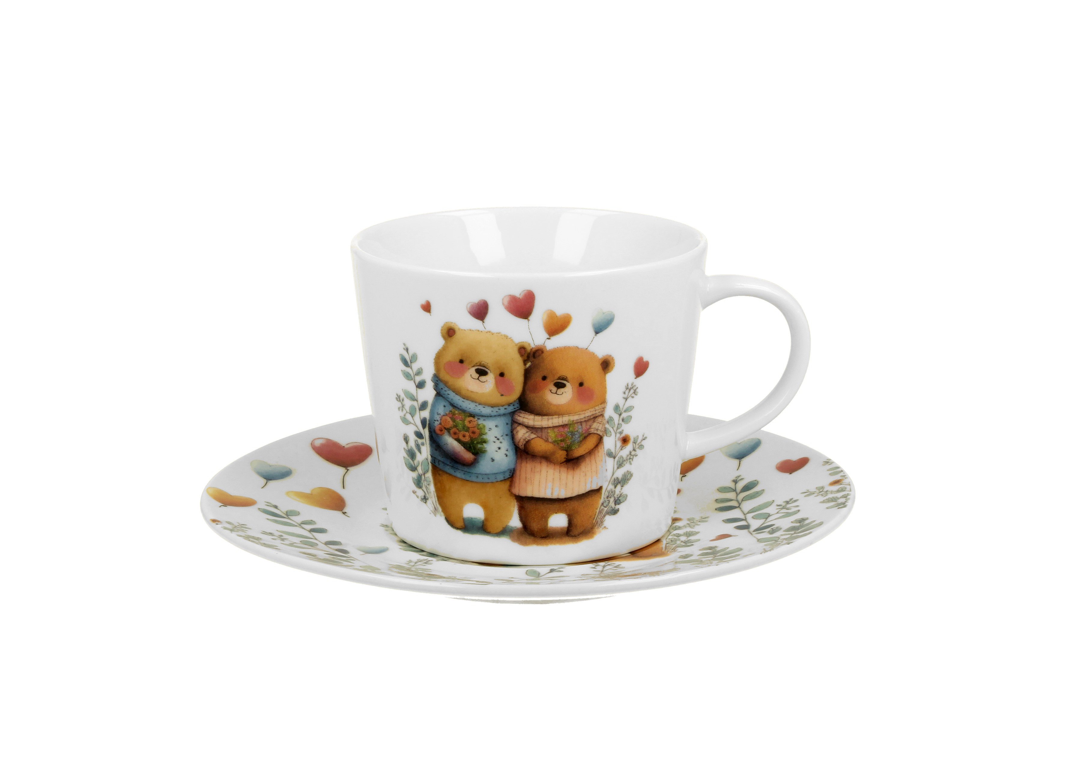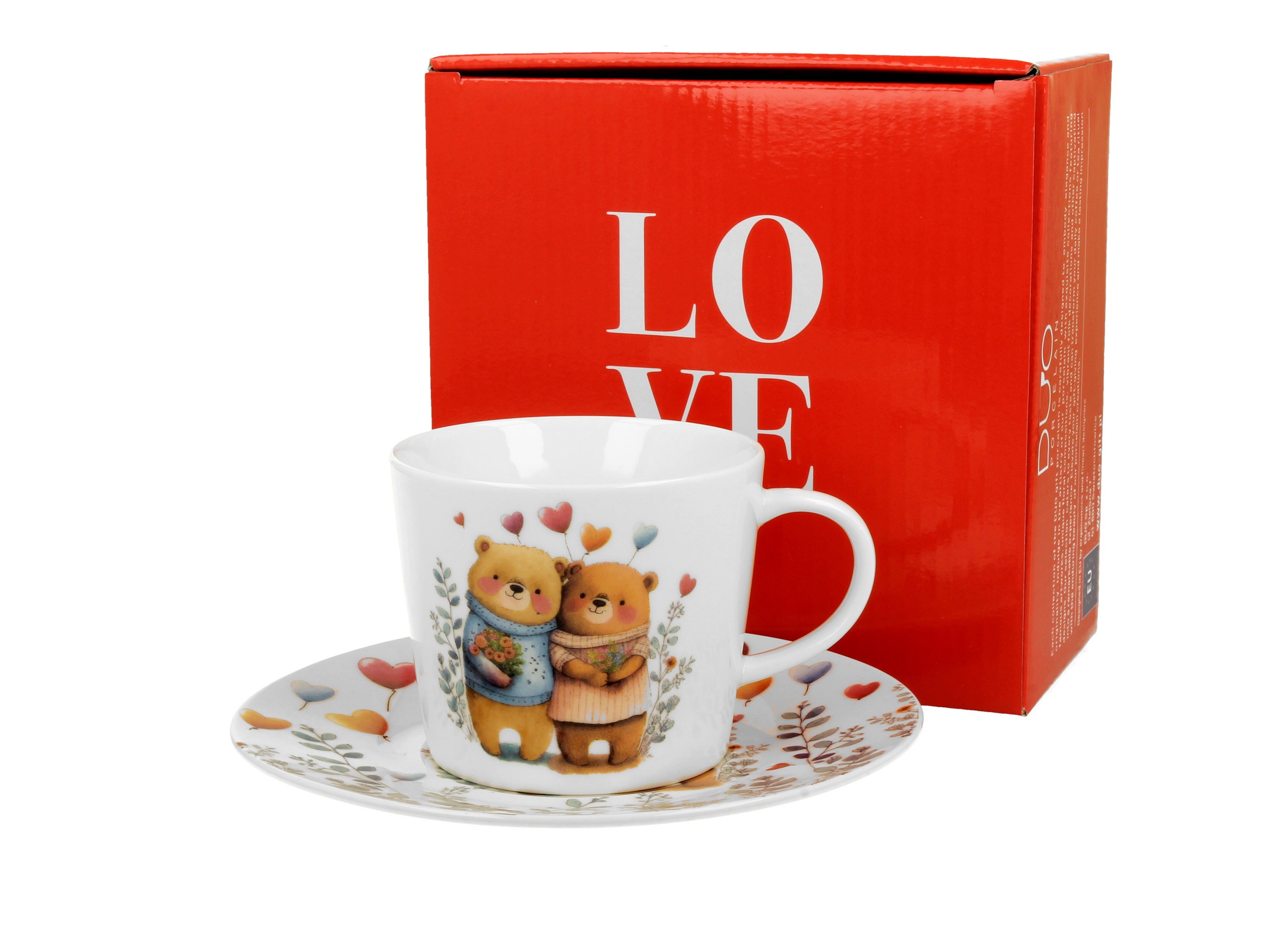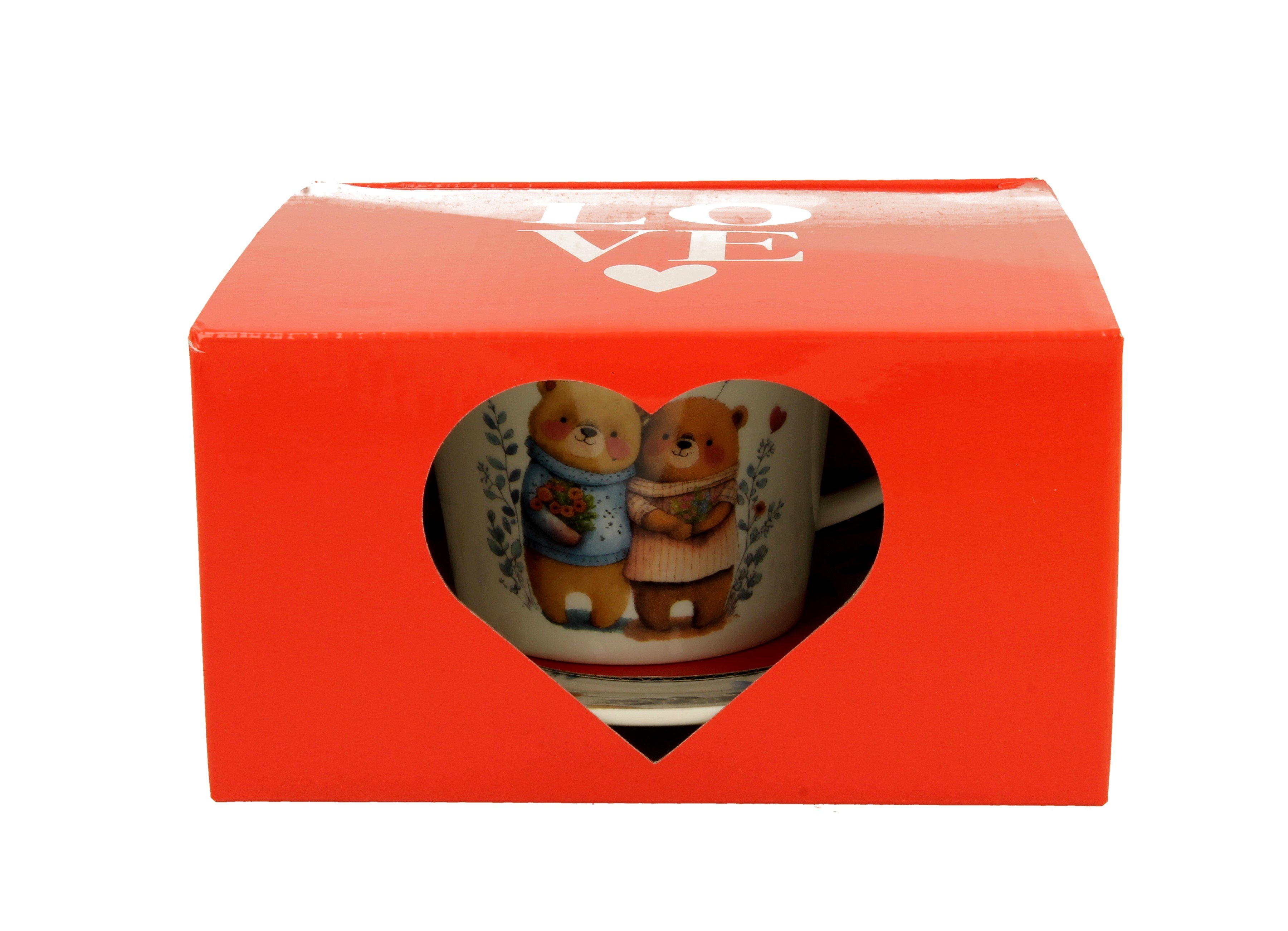 Elegantní porcelánový šálek s talířkem s motivem rozkošných zamilovaných medvídků zabalený v červené dárkové krabičce se srdíčkem. S tímto šálkem dostanou rána u kávy nebo večery s čajem nový, romantický rozměr.