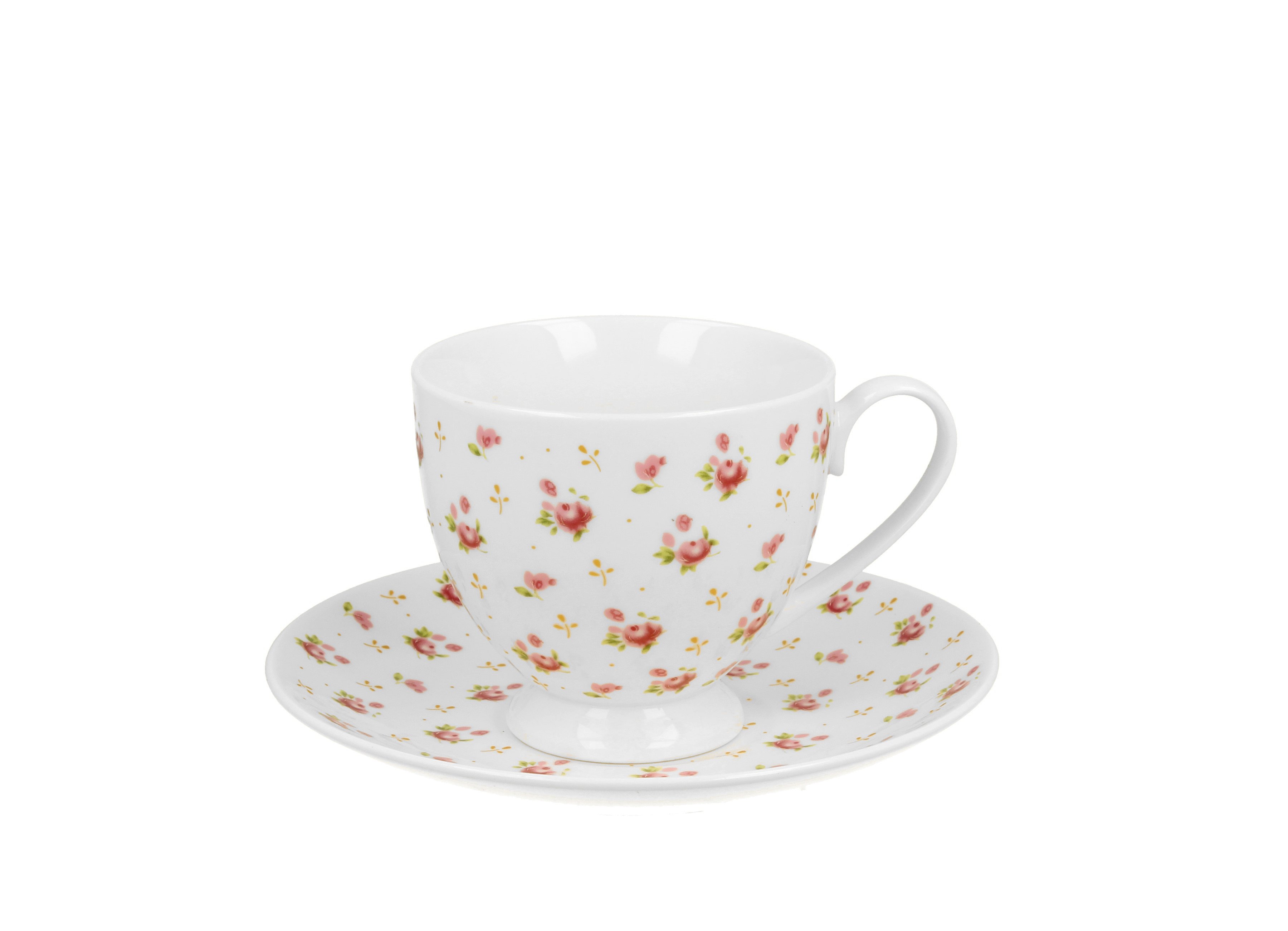 Šálek s podšálkem s motivem jemných, drobných větviček růží s lístečky.