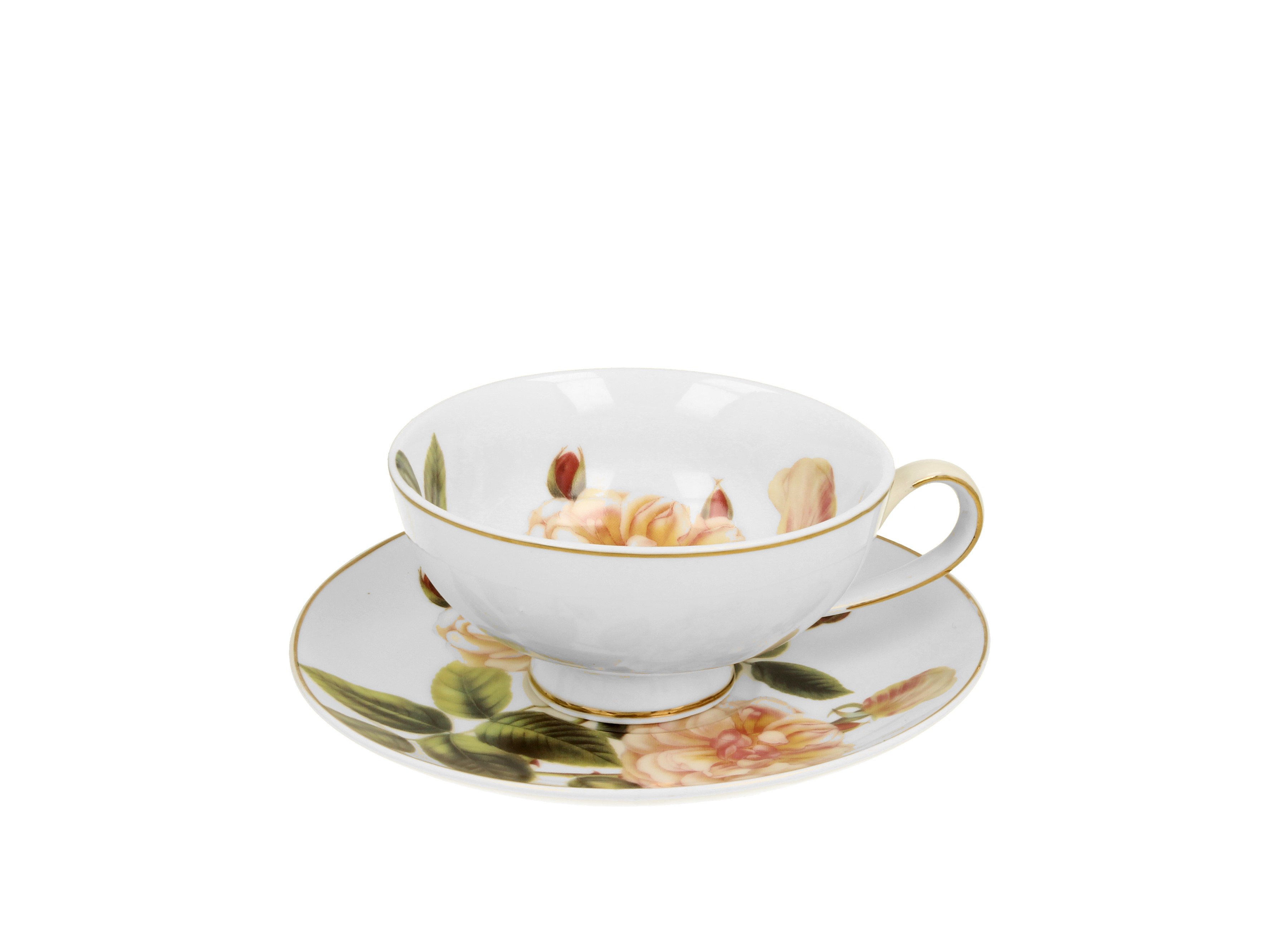 Šálek s podšálkem lemovaný zlatým proužkem s půvabnými květy růží.