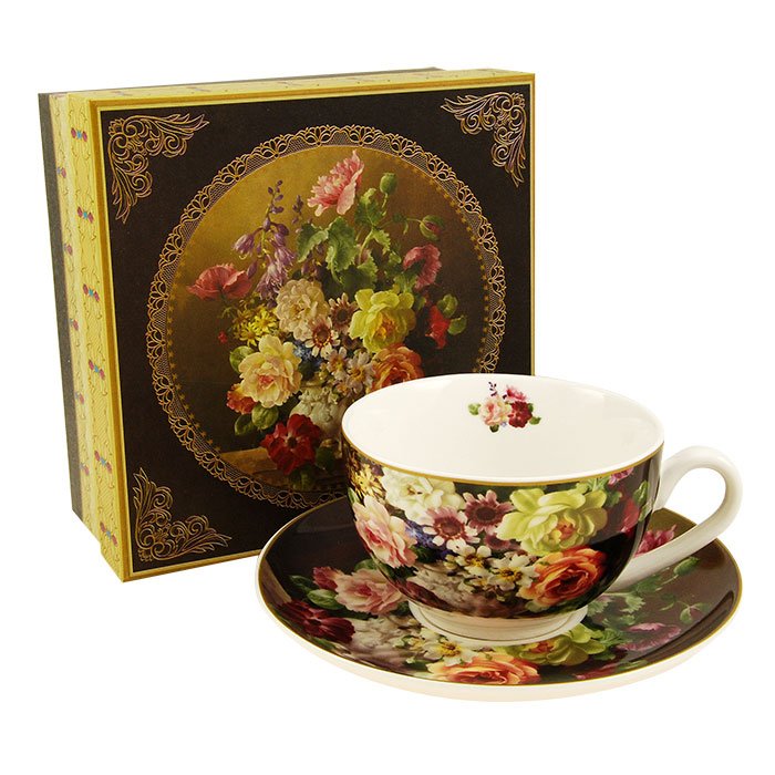 Set pro jednoho složený ze šálku a podšálky s motivem malovaných květů. V dárkovém balení.