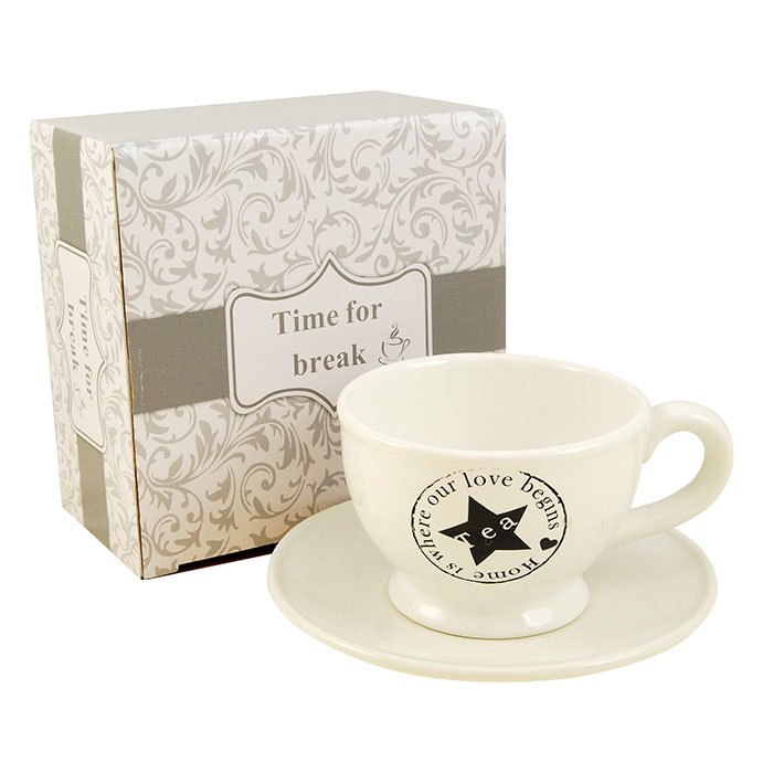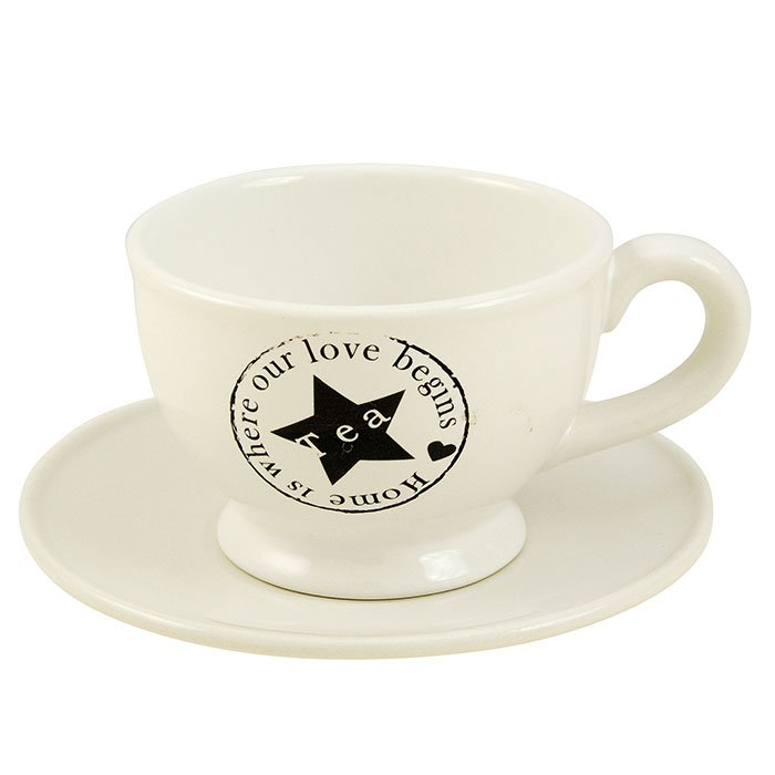 Šálek s podšálkem s nápisem " Home is where our love begins".