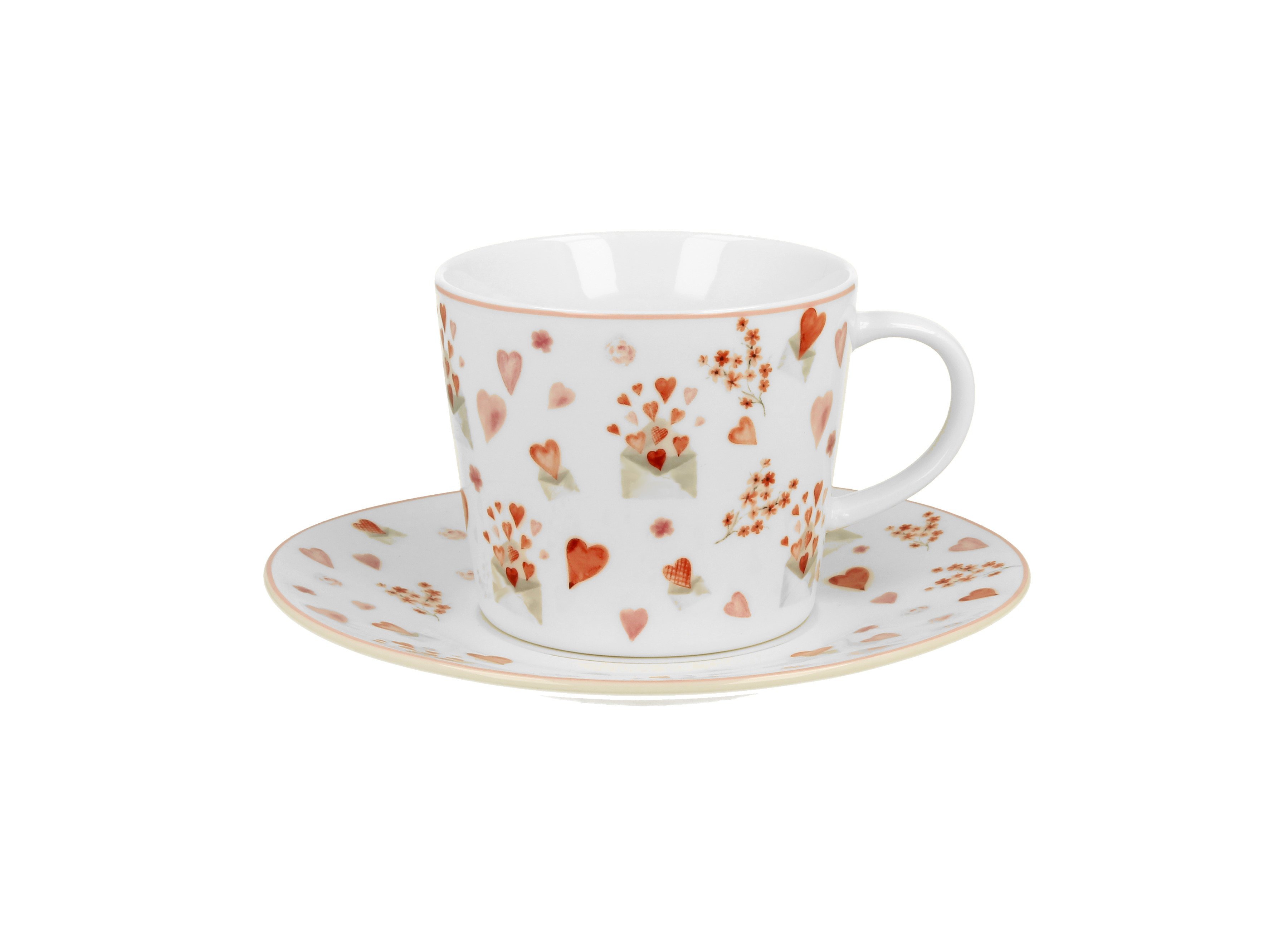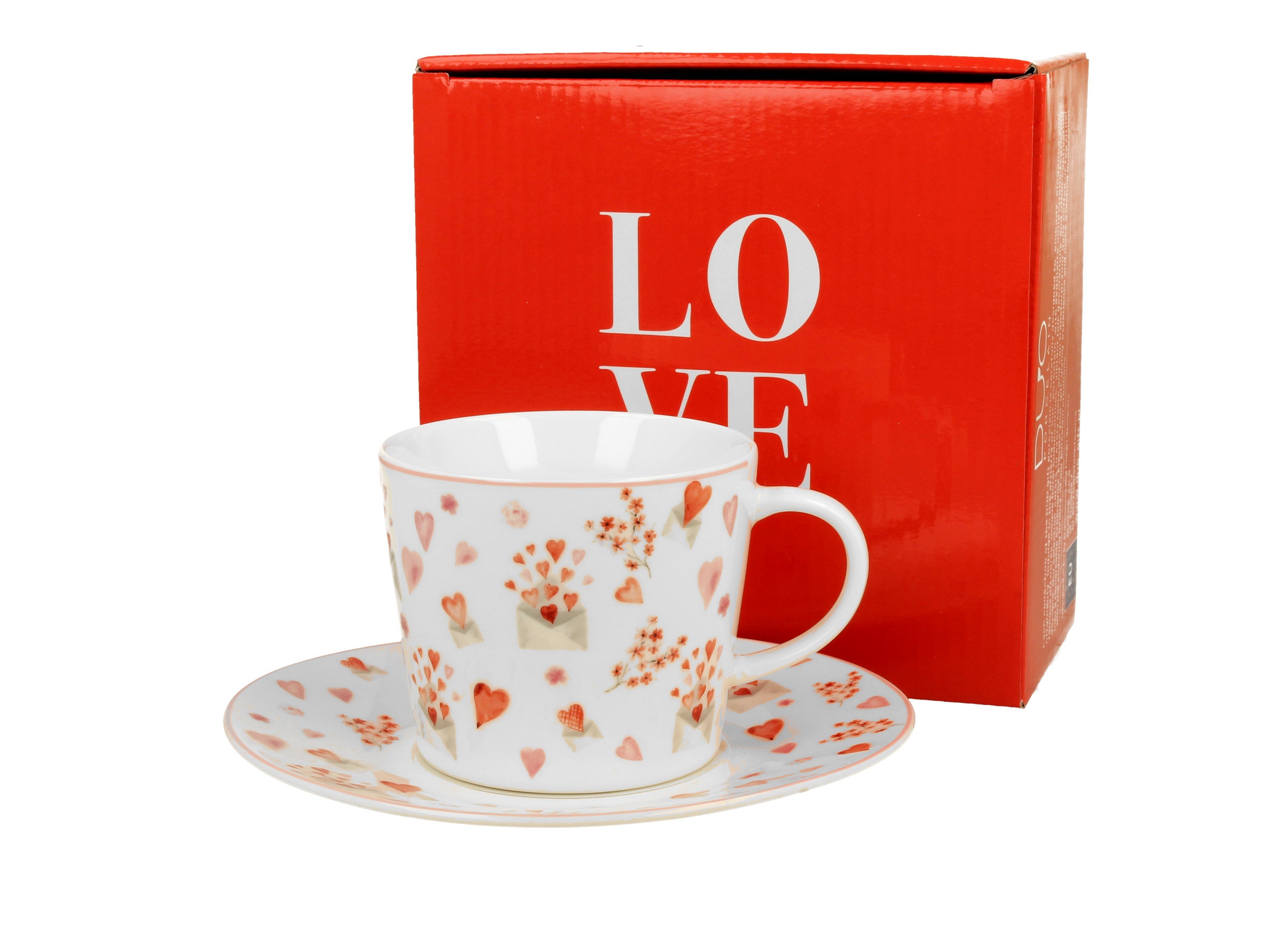 Elegantní porcelánový šálek s talířkem s valentýnským motivem otevřených obálek s jemnými srdíčky a kyticemi zabalený v červené dárkové krabičce se srdíčkem. S tímto šálkem dostanou rána u kávy nebo večery s čajem nový, romantický rozměr.