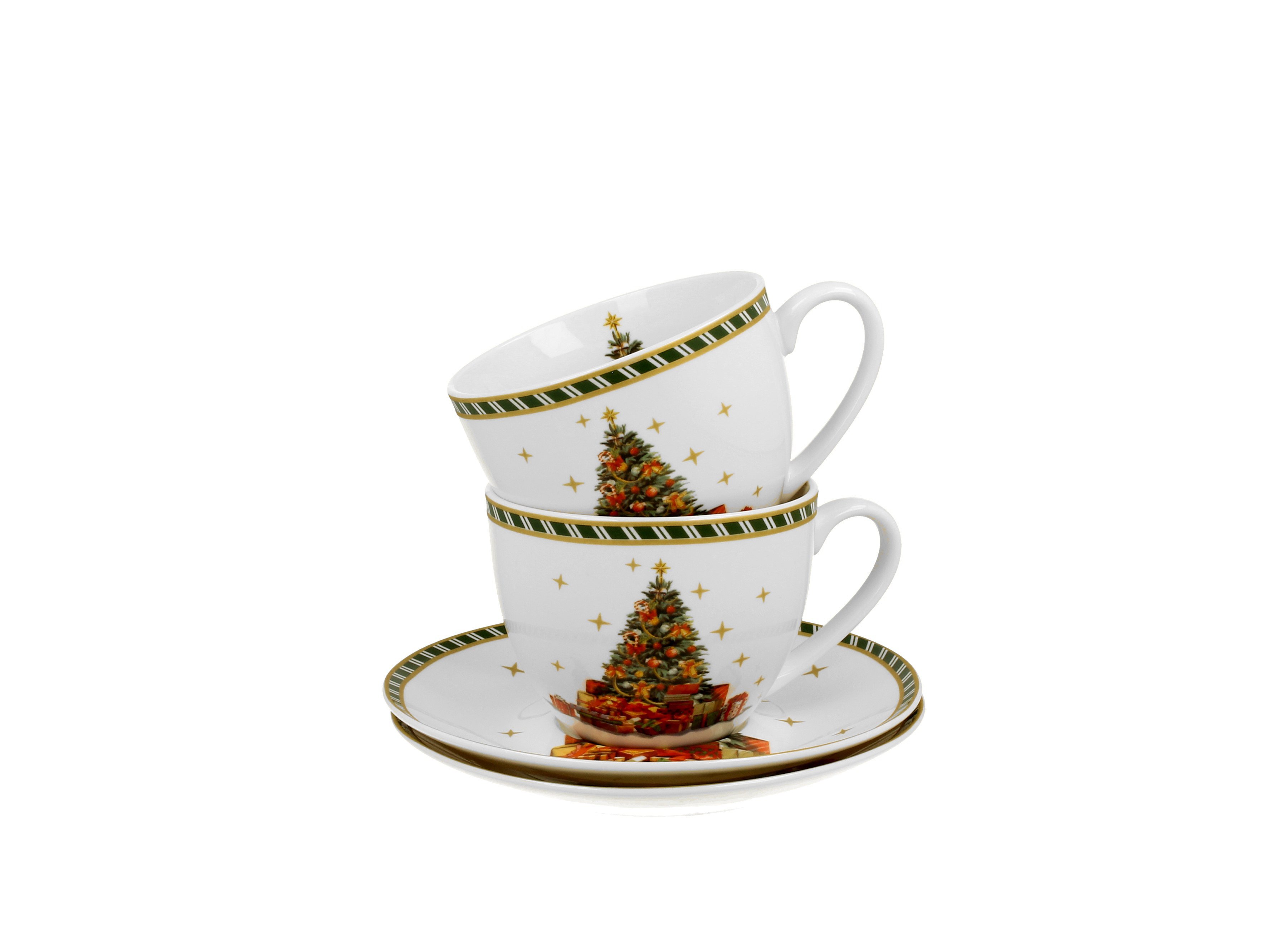 Sada dvou 280ml šálků s podšálky s typickým vánočním motivem ozdobeného stromku. Klasické červené, zelené a zlaté barvy dokonale odrážejí vánoční náladu.