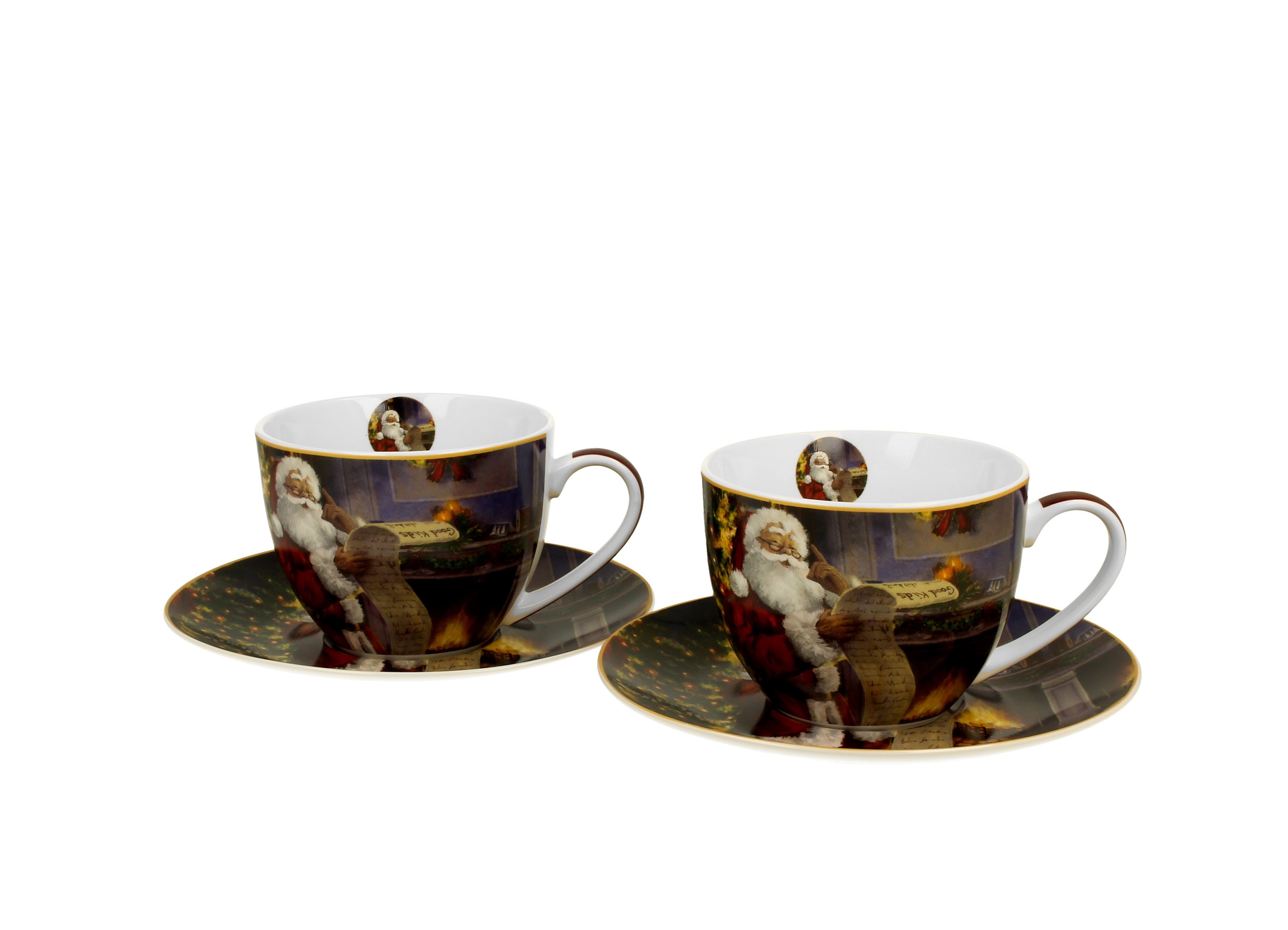 Sada dvou 90ml šálků s podšálky s motivem veselého Santa Clause, který čte dětské seznamy přání.