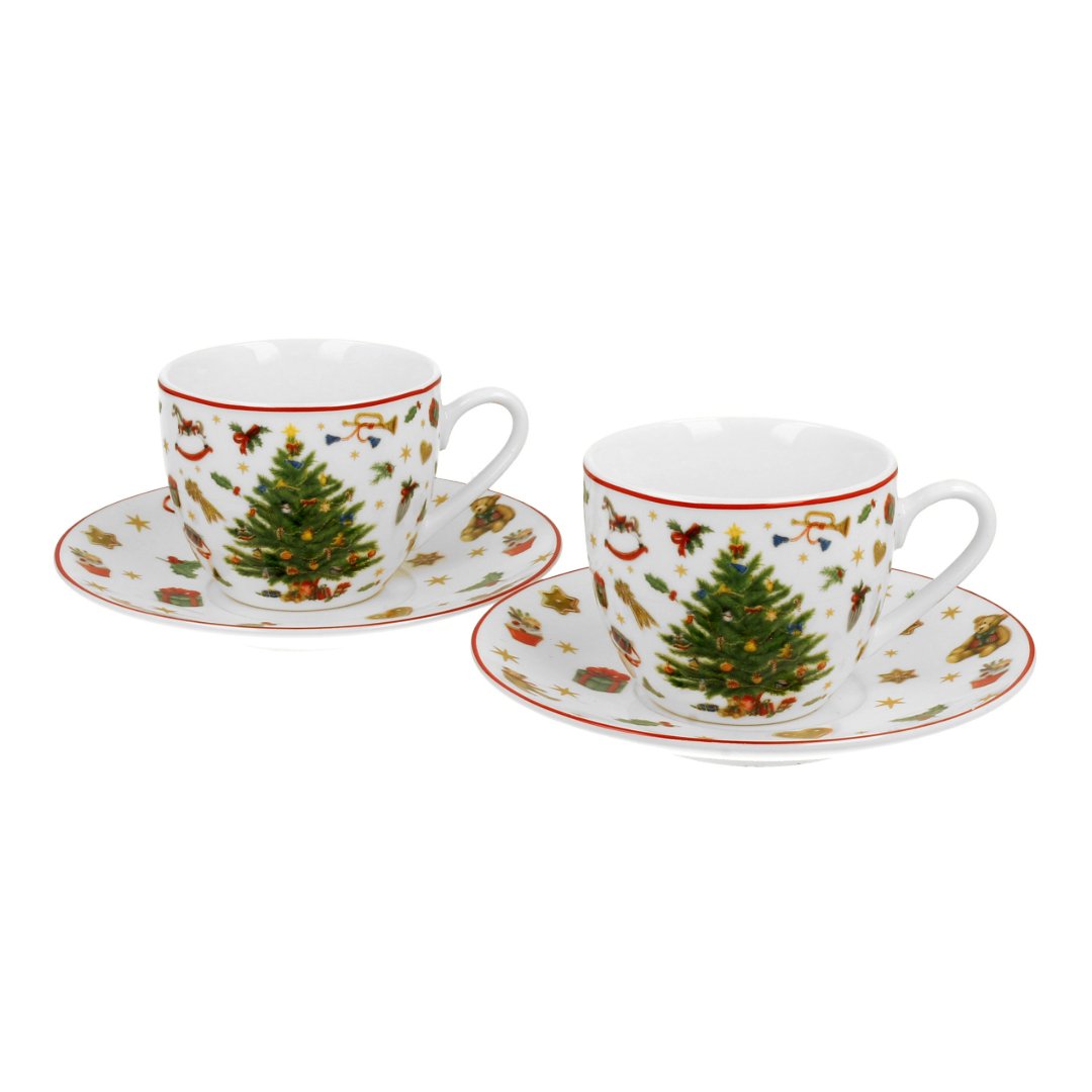 Sada dvou 90ml šálků s podšálky s typickým motivem vánočního stromečku obklopeného drobnými svátečními ozdobami.