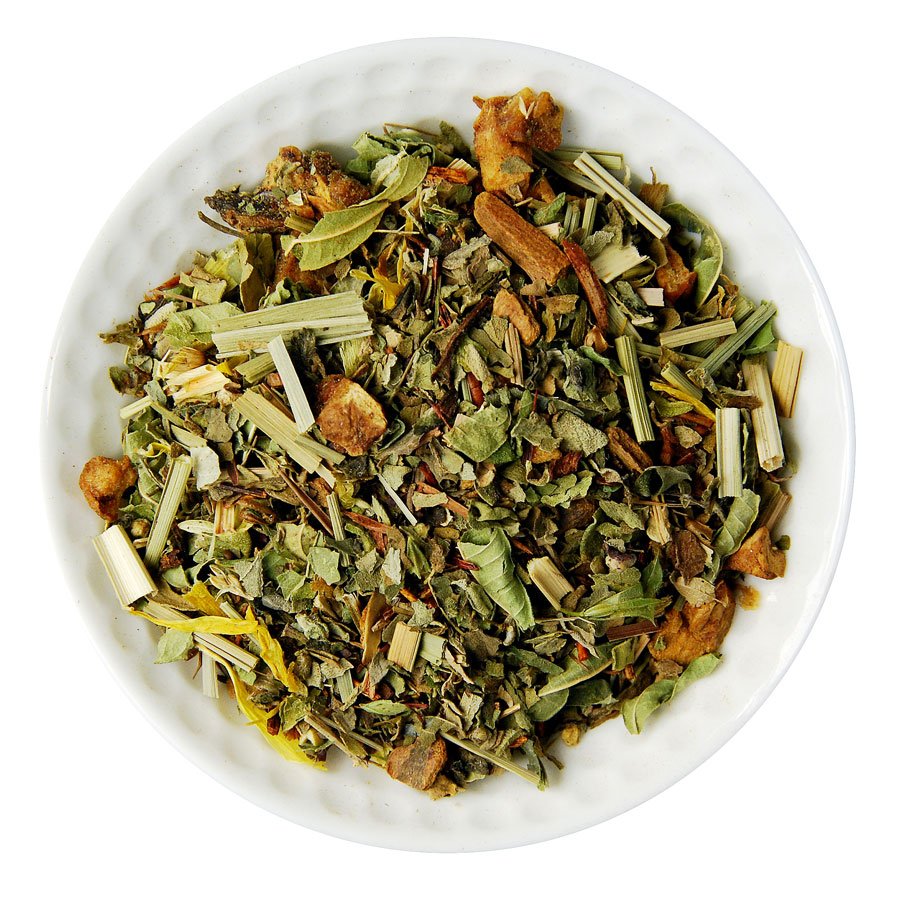 Složení: Tulsi (min. 44%), jablkové kousky, citrónová tráva, sporýš, skořice, honeybush, citrónové listy, aroma, rooibos, květy měsíčku