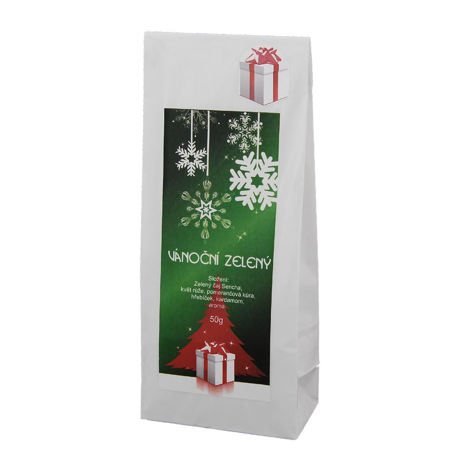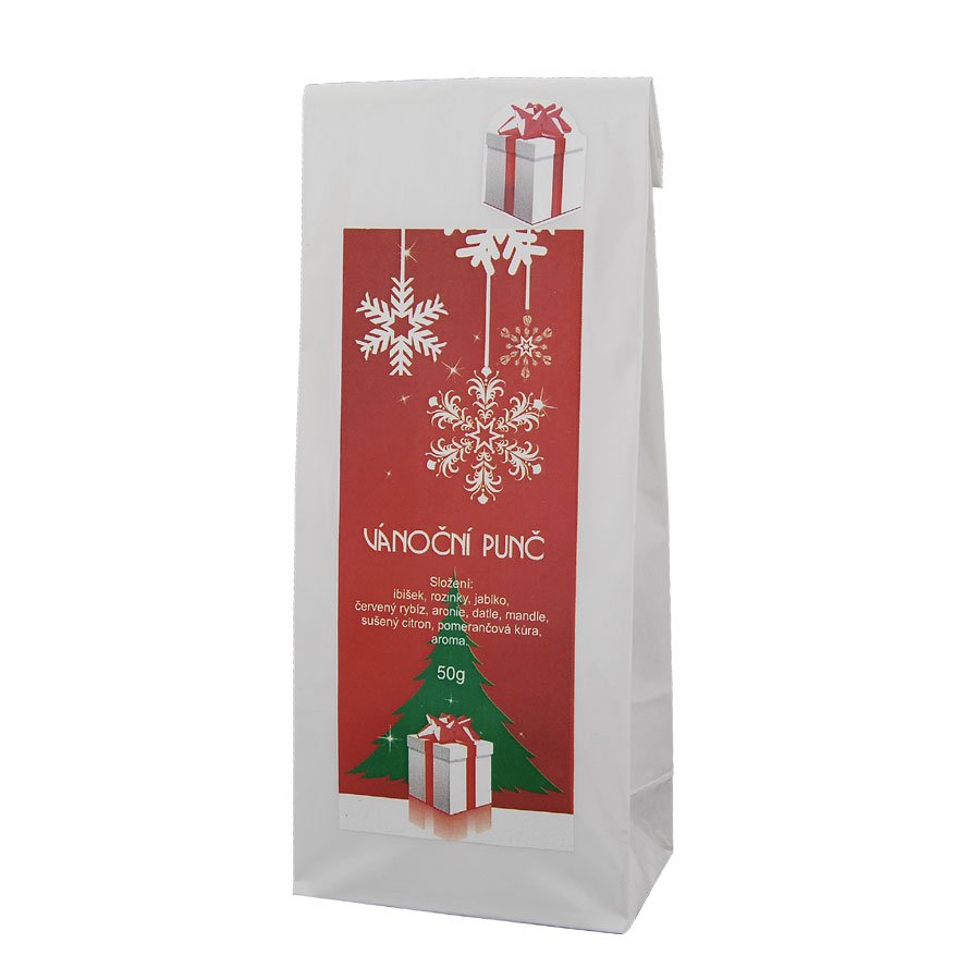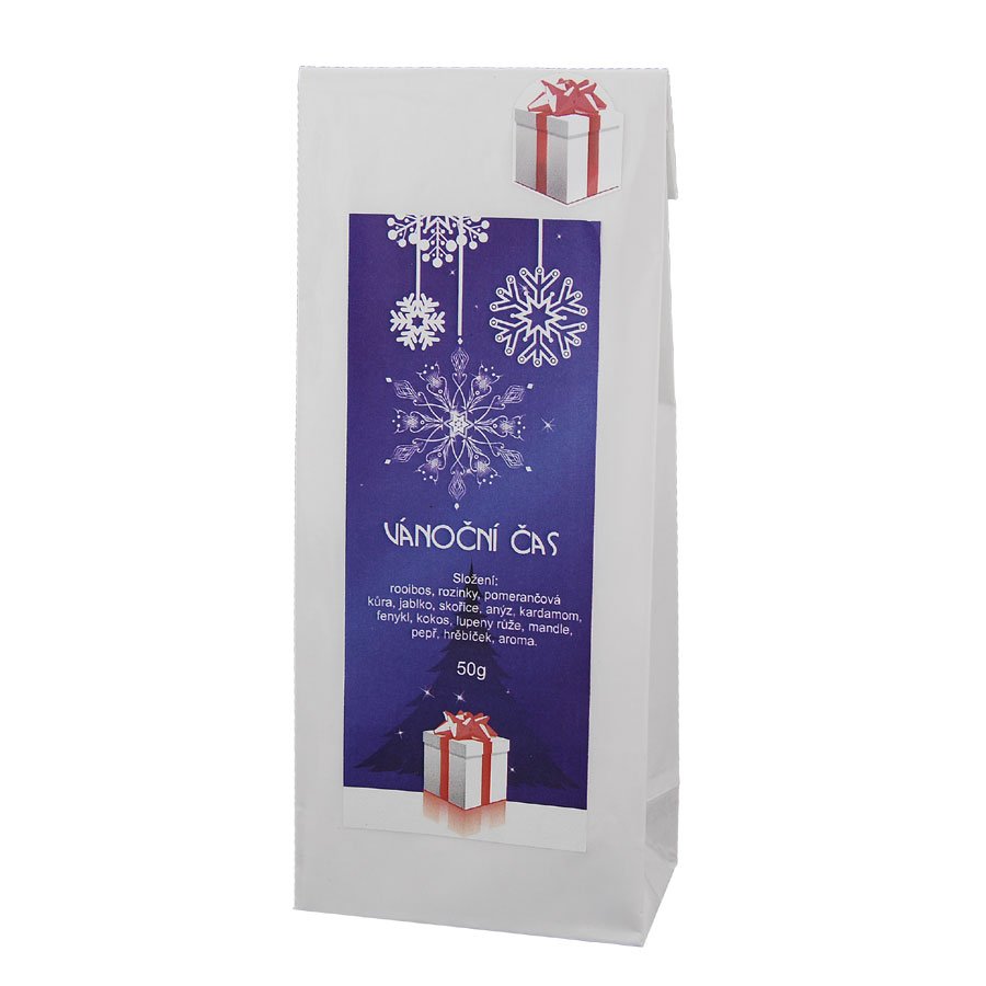 Dárkový čaj v bílém sáčku s vánočním motivem.