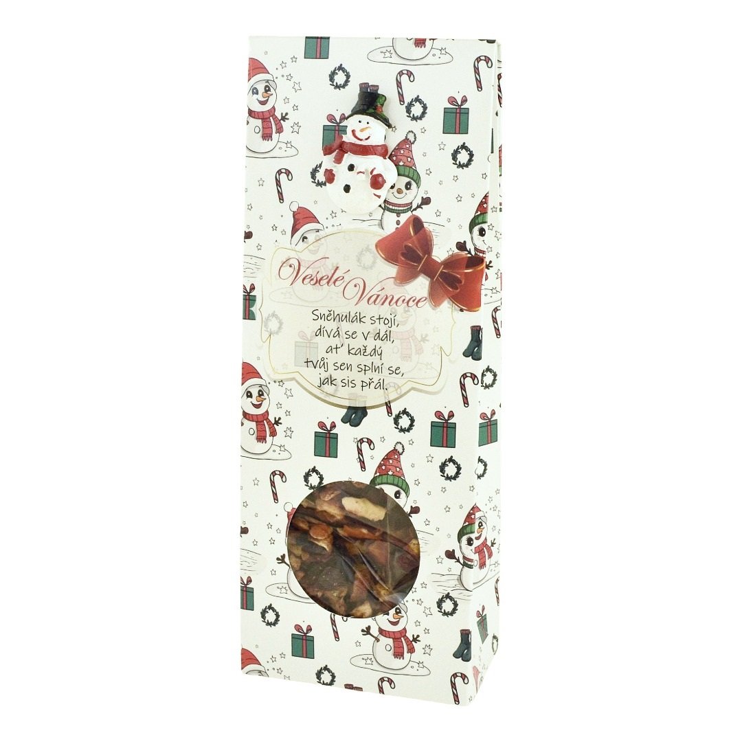 Dárková krabička s hravým motivem plným veselých sněhuláčků a dekorací sněhuláka s cylindrem.