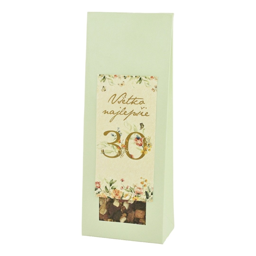 Dárková krabička s motivem velké zlaté „třicítky“ obklopené jemnými květinami a motýlky, které dodávají celkovému designu elegantní a svěží vzhled.