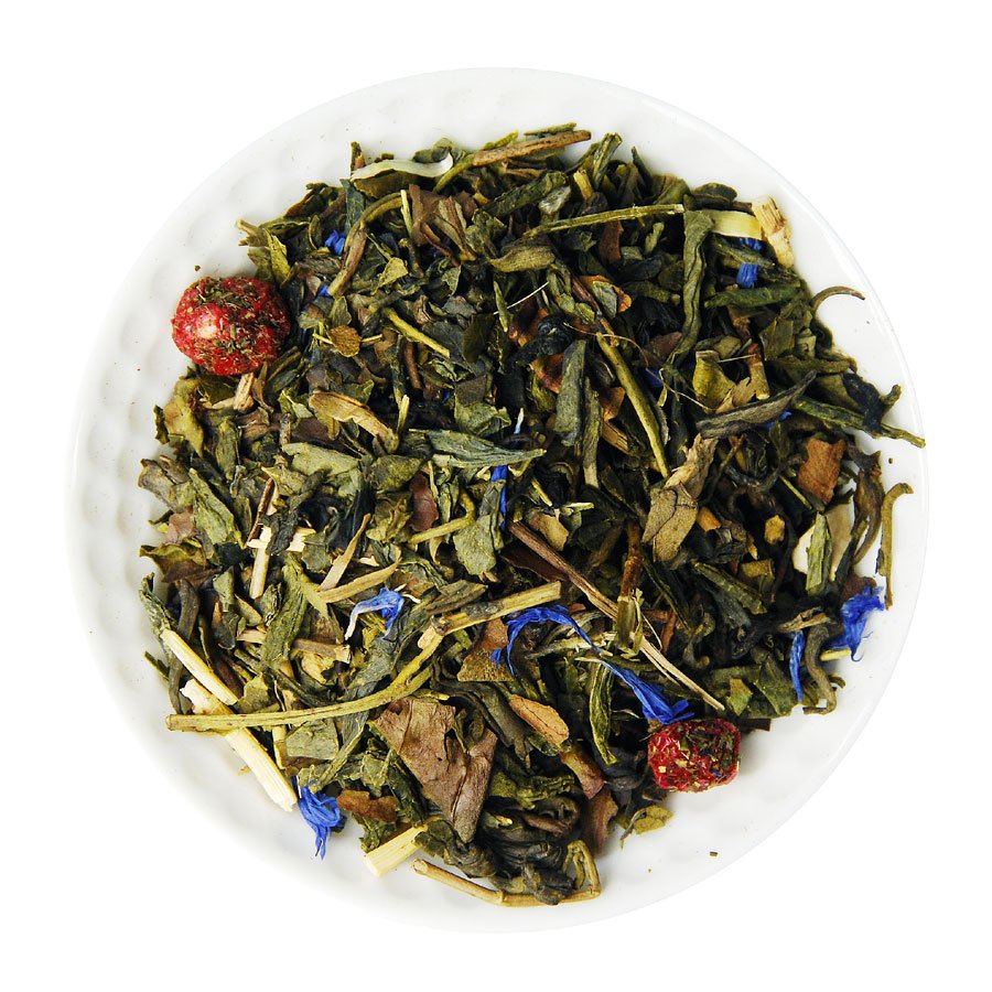 Složení: zelený čaj China Sencha, Ming Mee, bílý čaj China Pai Mu Tan, zelený čaj China Gunpowder, China Wu Lu, aroma, červený a černý rybíz, ženšen kořen, květy chrpy polní, kousky meruněk (meruňka, rýžová mouka) (1%)