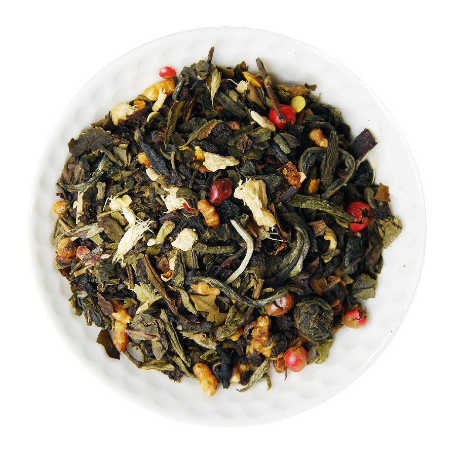 Složení: zelený čaj China Fog Tea, Gunpowder, pražená rýže, bílý čaj China Pai Mu Tan, zelený čaj China Jasmine, bílý čaj China Chun Me, zelený čaj Dajreeling, zelený čaj China Silvery Needle, kousky zázvoru, aroma, růžové koření, kousky chilli, kousky jahod (1%)