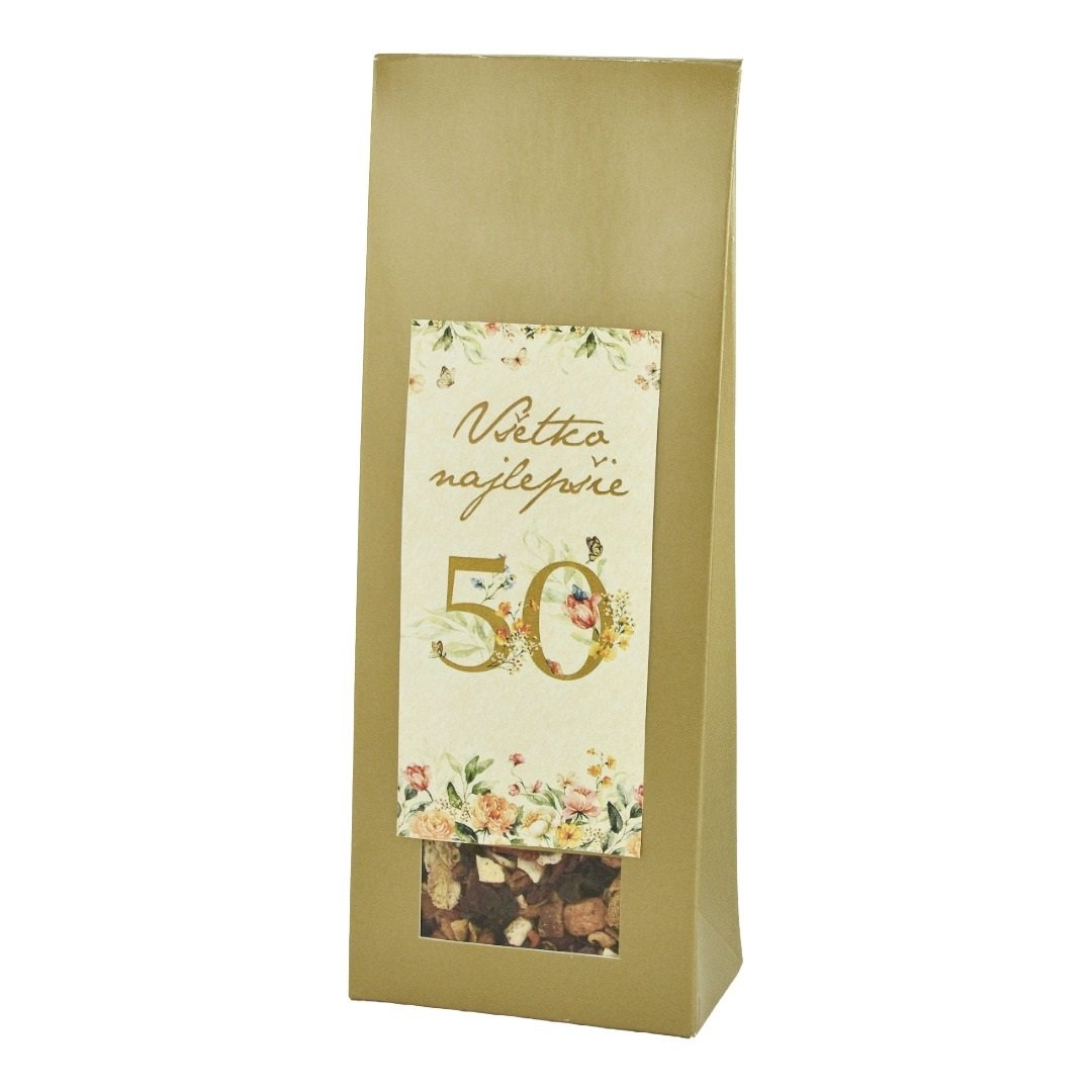 Luxusní zlatá dárková krabička s motivem velké zlaté „padesátky“ obklopené jemnými květinami a motýlky, které dodávají celkovému designu elegantní a svěží vzhled.